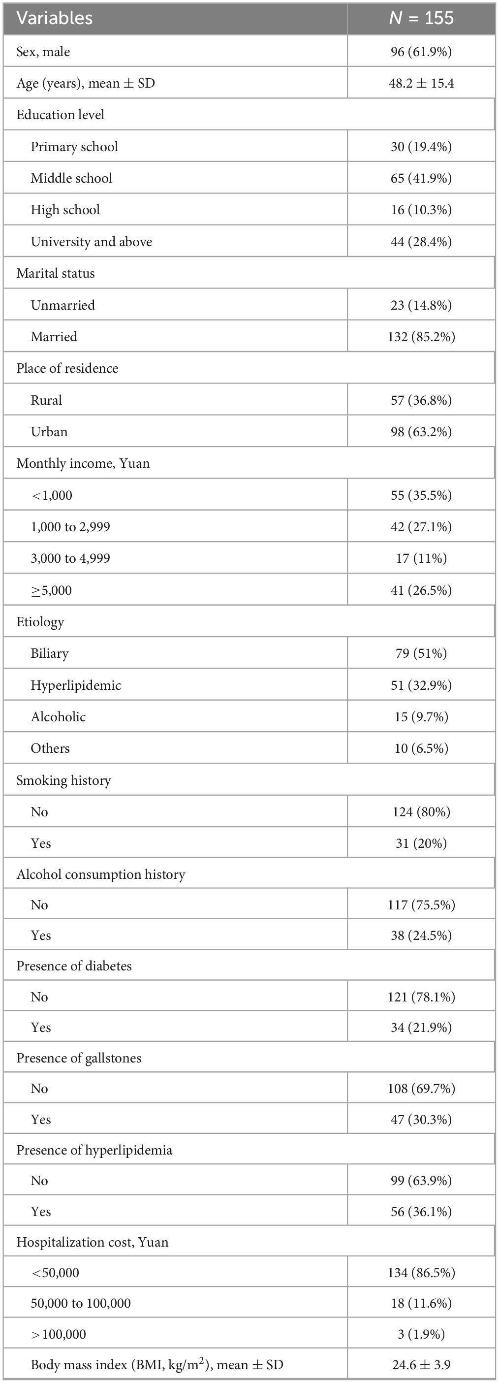Table 1 details sociodemographic and disease-related variables of the cohort (N = 155) at baseline. The cohort was composed predominantly of married (85.2%), urban (63.2%), males (61.9%), with a mean age of 48.2 years (SD = 15.4). In terms of education, the largest group had completed middle school (41.9%). Most reported monthly incomes below 3,000 Yuan (62.6%). Clinical profiles revealed biliary (51.0%) and hyperlipidaemic (32.9%) etiologies. Smoking and alcohol histories were present in 20.0% and 24.5%, respectively. Comorbid gallstones and hyperlipidemia affected 30.3% and 36.1%. The mean body mass index (BMI) was 24.6 kg/m2 (SD = 3.9), and 86.5% incurred hospitalization costs under 50,000 Yuan.