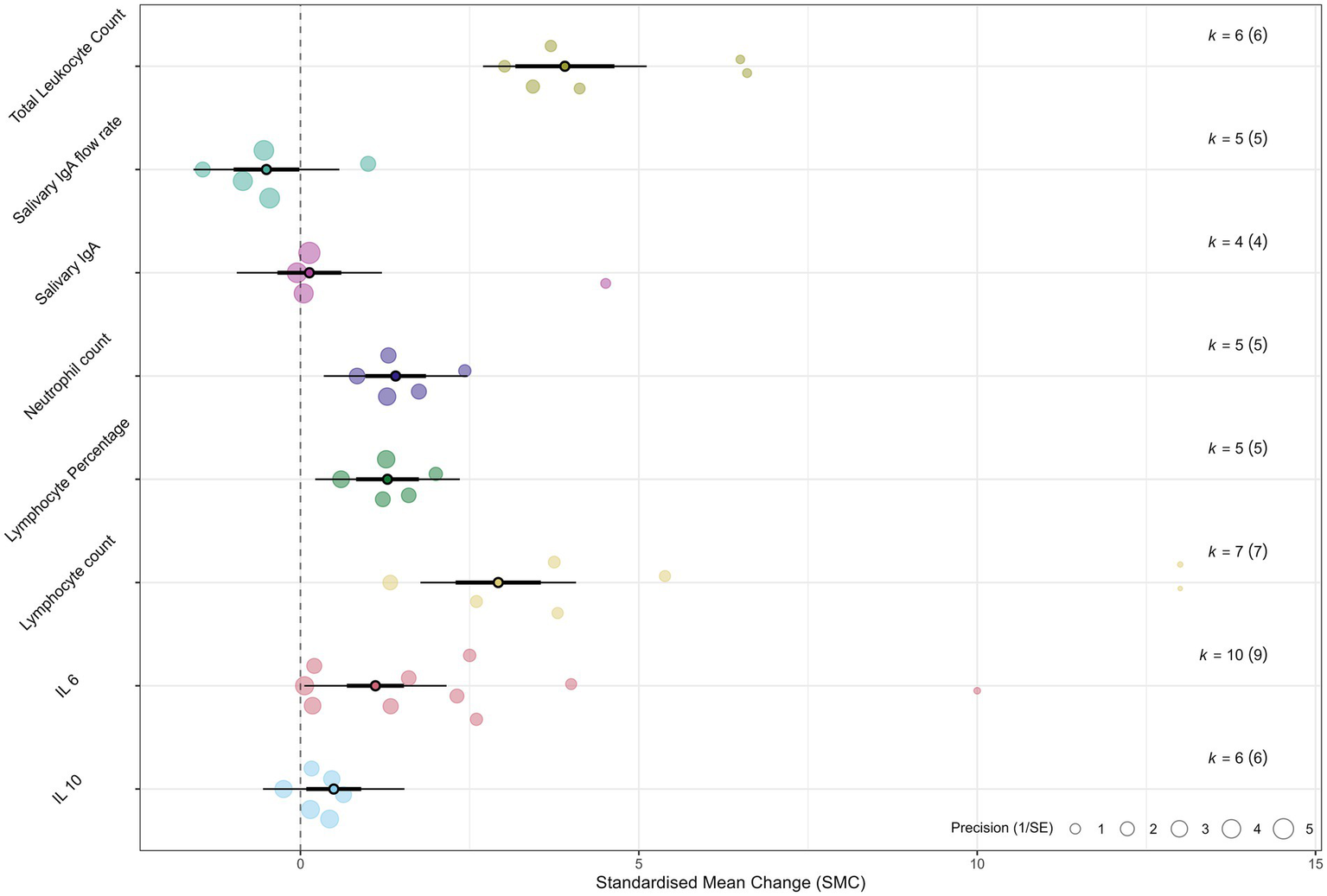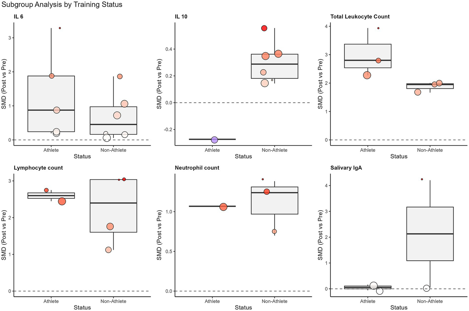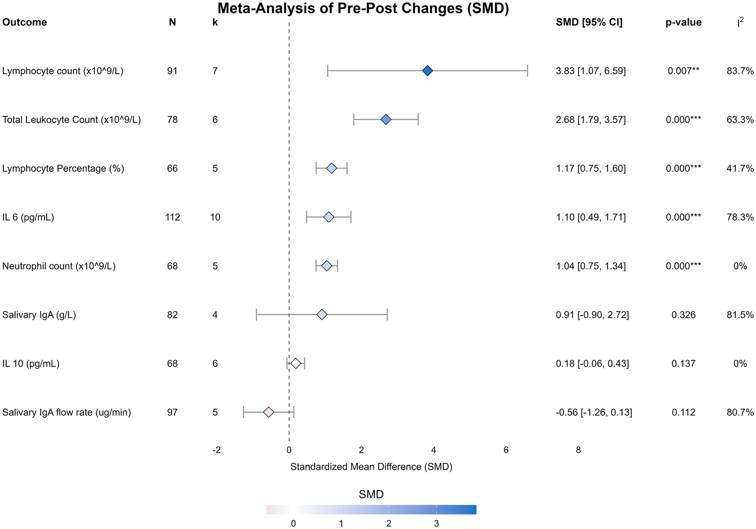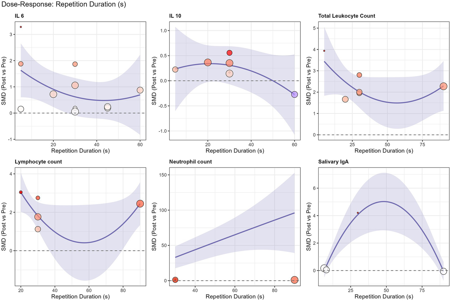 We systematically searched PubMed, Web of Science, SPORTDiscus, the Cochrane Library, Embase, and Scopus for experimental studies assessing acute immunological changes following a single bout of SIT in healthy participants. Pooled standardized mean differences (SMDs) and 95% confidence intervals (CIs) were calculated using a random-effects model. Non-linear meta-regression and subgroup analyses were performed to investigate sources of heterogeneity, and the certainty of evidence was evaluated using the Grading of Recommendations Assessment, Development and Evaluation (GRADE) methodology.