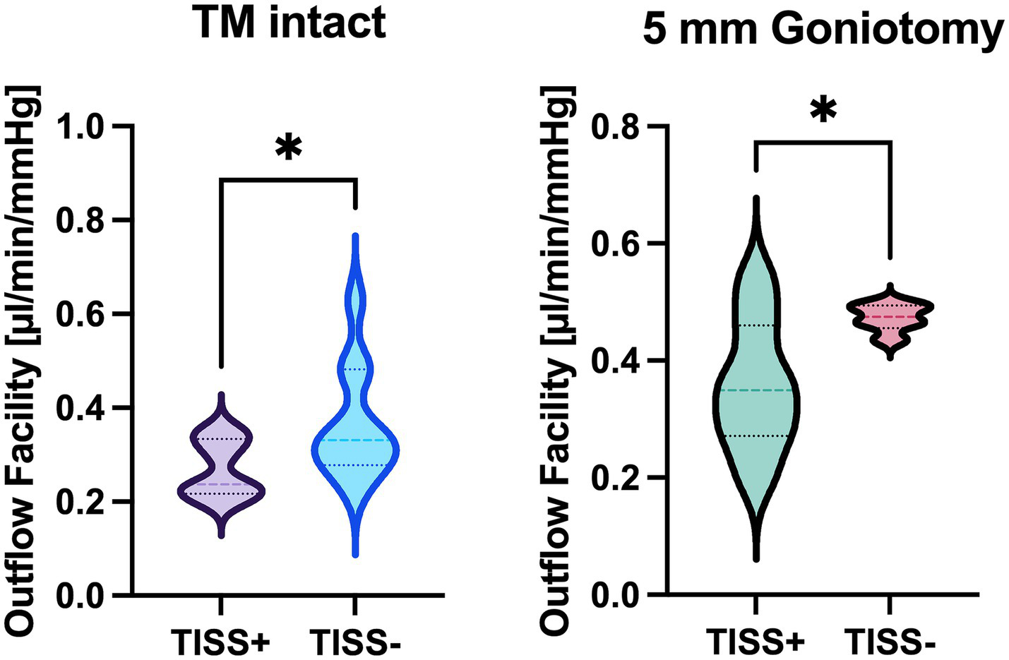 Total outflow facility comparison between TISS+ and TISS− globes with intact TM (left panel) and after goniotomy (right panel). *p < 0.05 for unpaired t-test.