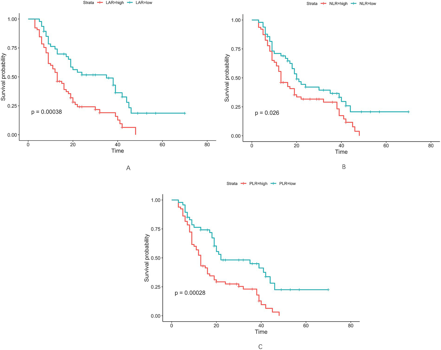 Optimal cut-off values for LAR (A), NLR (B), and PLR (C) were determined as 4.67 U/L, 2.98 U/L, and 155.47 U/L, respectively, using maximally selected rank statistics.
