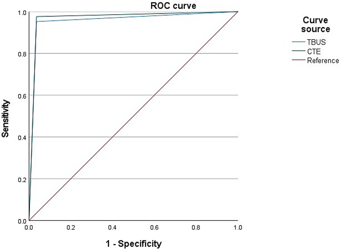 Figure 1. Receiver operating characteristic (ROC) curves for diagnosing intestinal stenosis. The area under the curve (AUC) for transabdominal bowel ultrasonography (TBUS) was 0.958 (95% CI: 0.911–1.000). The AUC for computed tomography enterography (CTE) was 0.970 (95% CI: 0.931–1.000). The difference between the two AUCs was not statistically significant (DeLong test, p = 0.56).