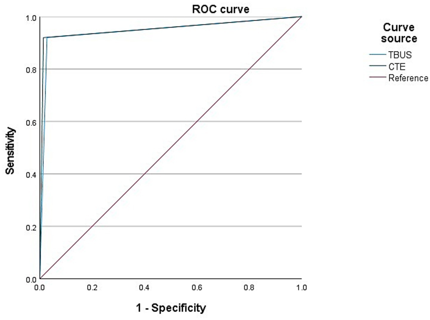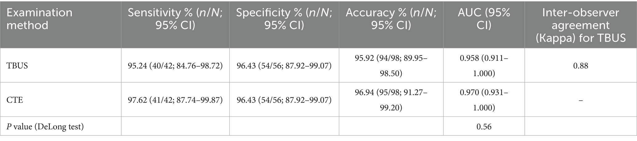 The evaluation of diagnostic performance is based on the original diagnostic results (such as presence/absence) rather than a predetermined single diagnostic threshold. We calculated the sensitivity, specificity, accuracy, and the corresponding 95% confidence intervals (CIs) for each complication diagnosed by CTE and TBUS. Simultaneously, receiver operating characteristic (ROC) curves were plotted, and the areas under the curves and their 95% CIs were calculated. The DeLong test was used to statistically compare the AUCs of TBUS and CTE to assess the differences in diagnostic performance between the two methods. A p value < 0.05 was considered statistically significant. All statistical analyses were performed using SPSS 27.0 and R software (version 4.2.1, using the pROC package for the DeLong test).