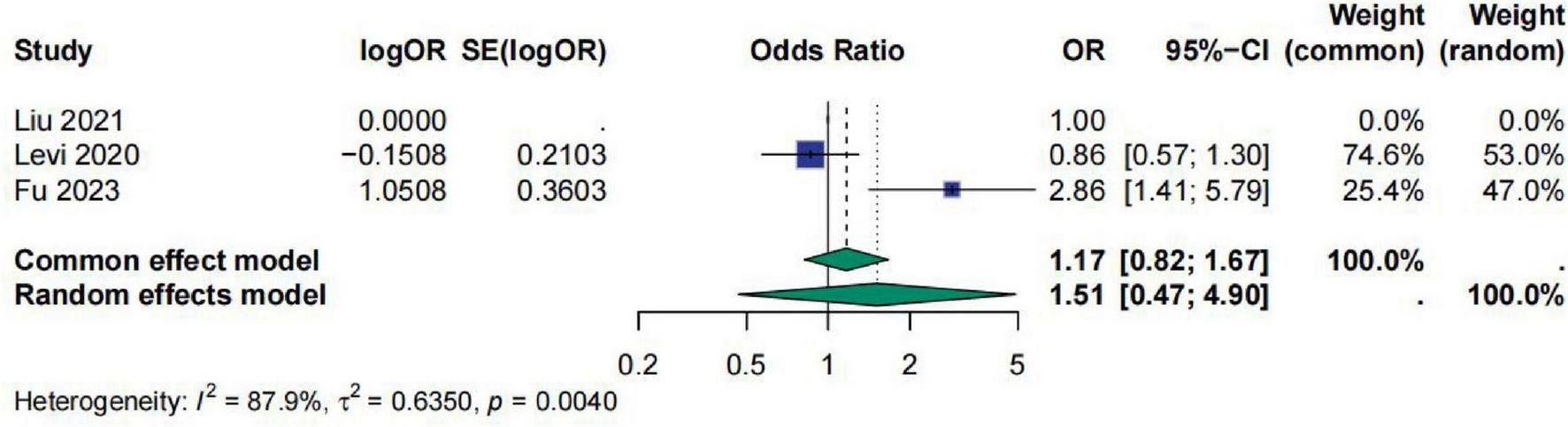 ![Forest plot showing meta-analysis results of two studies, Liu 2021 and Lemiale 2022. Liu 2021 has a logOR of 0.1266 and SE(logOR) of 0.0496, while Lemiale 2022 has a logOR of 1.7120 and SE(logOR) of 0.4317. Odds ratios with 95% confidence intervals are 1.14 [1.03; 1.25] for Liu 2021 and 5.54 [2.38; 12.91] for Lemiale 2022. Common effect model OR is 1.16 [1.05; 1.28], and random effects model OR is 2.37 [0.50; 11.14]. Heterogeneity statistics indicate I² = 92.5%, τ² = 1.1623, p = 0.0003.](https://www.frontiersin.org/files/Articles/1706082/xml-images/fmed-12-1706082-g004.webp)