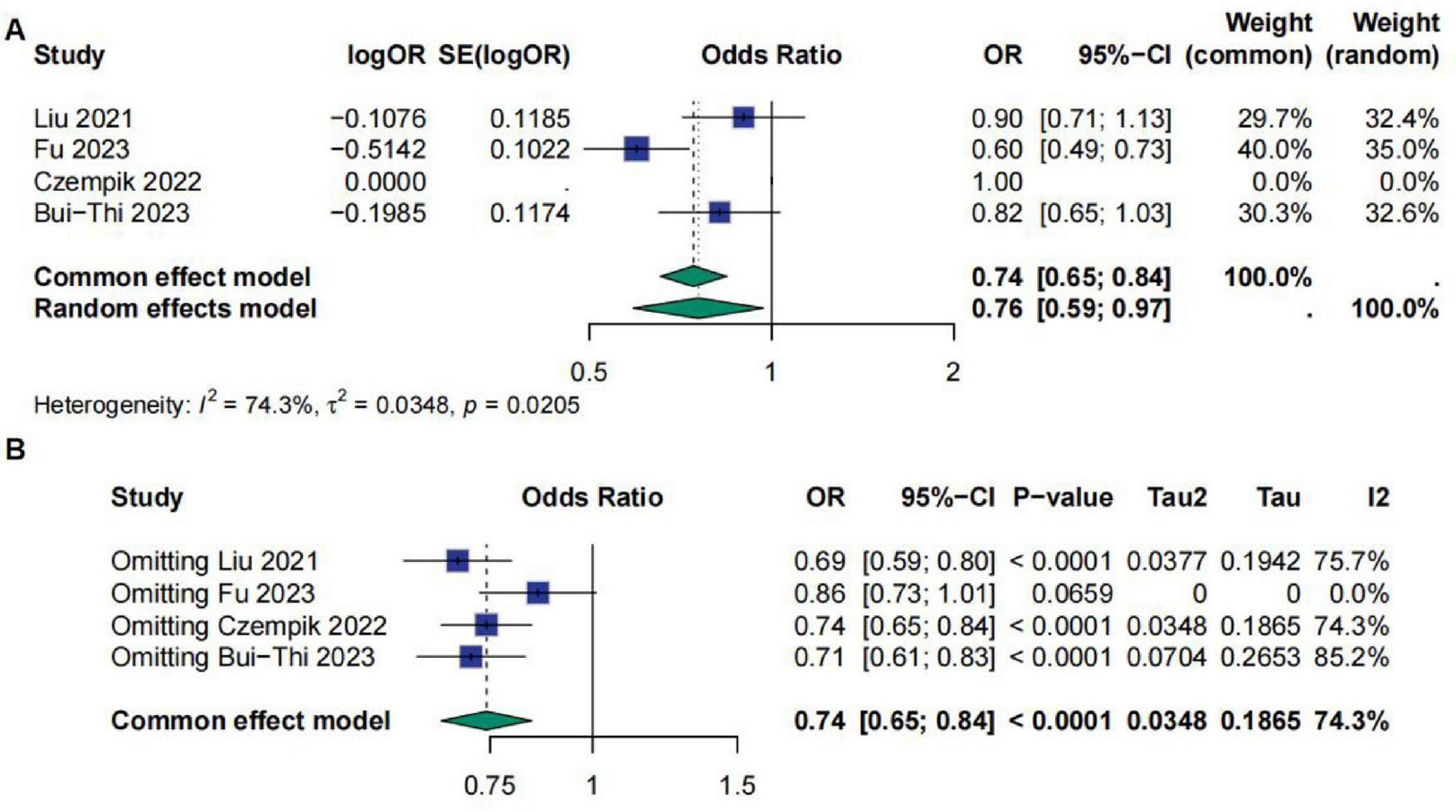 A total of four studies involved Fib (fibrinogen). The meta-analysis results indicated that the OR for Fib was 0.76 [95% CI (0.59; 0.97)], suggesting a significant correlation between Fib and sepsis prognosis. However, the results showed high heterogeneity, with I2 = 74.3%, τ2 = 0.0348, and p = 0.0205. Sensitivity analysis demonstrated that after excluding the study by Fu et al., the results became non-significant (Figure 6).