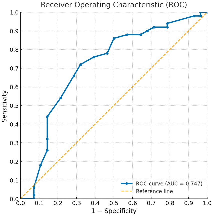 Figure 1. ROC curve for the SAALIQ questionnaire in discriminating patients with absent or mild QoL impairment (SAALIQ < 20), using the dichotomised DLQI as the reference standard. The area under the curve (AUC) was 0.747.