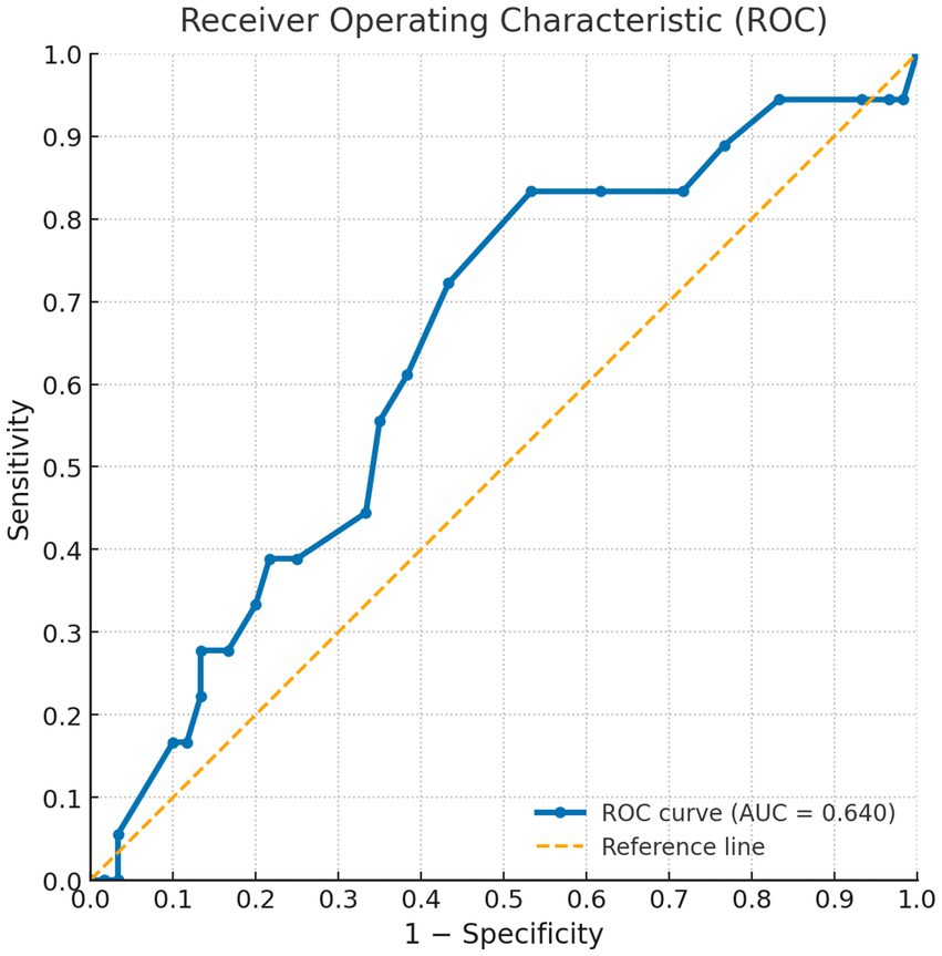 Figure 2. ROC curve for the SAALIQ questionnaire in discriminating patients with moderate QoL impairment (SAALIQ ≥ 20), using the dichotomised DLQI as the reference standard. The area under the curve (AUC) was 0.640.