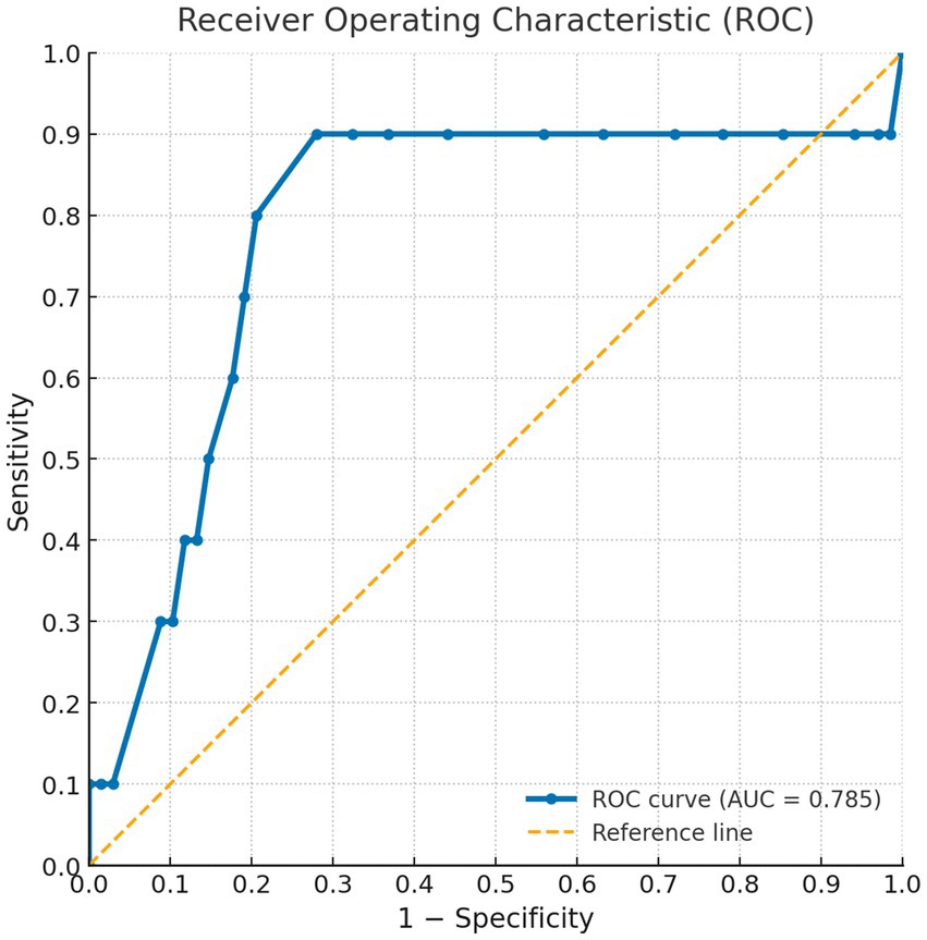Figure 3. ROC curve for the SAALIQ questionnaire in discriminating patients with severe QoL impairment (SAALIQ > 26), using the dichotomised DLQI as the reference standard. The area under the curve (AUC) was 0.785.