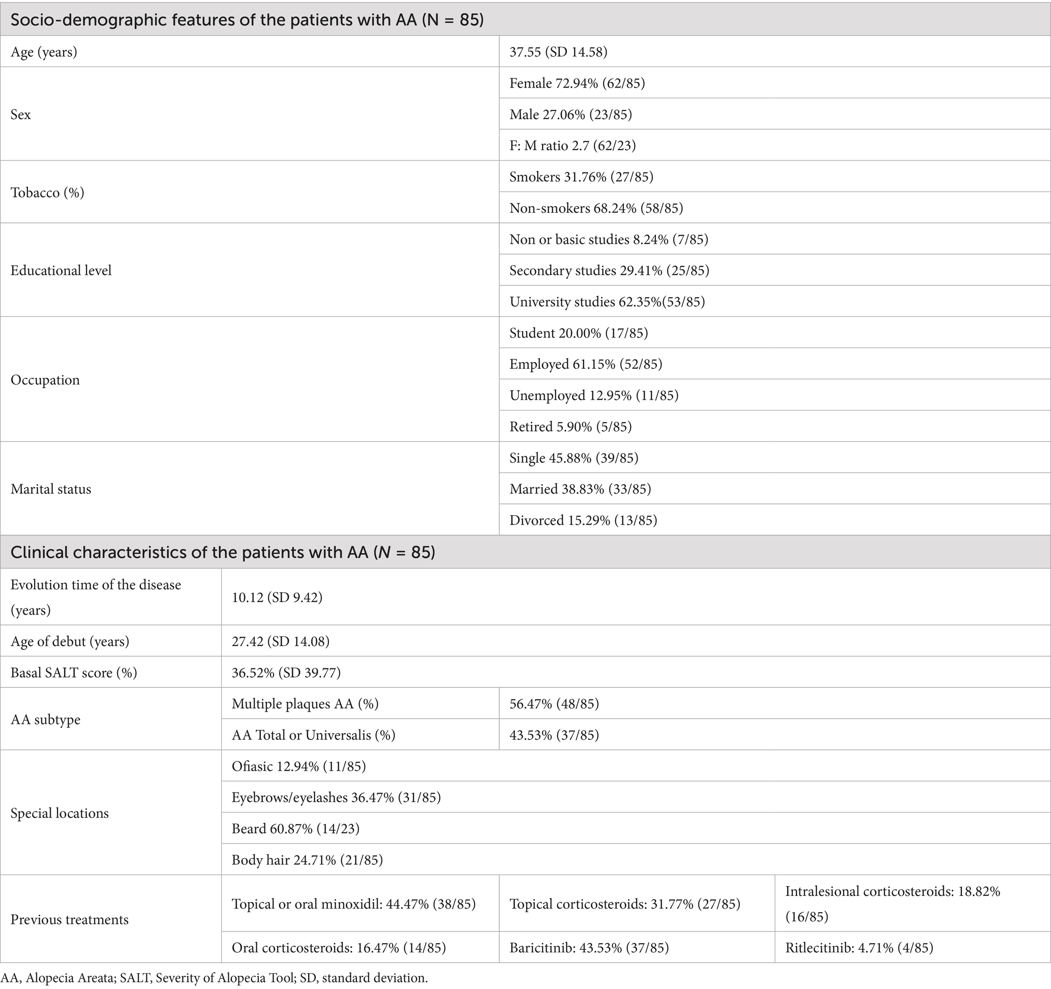 A total of 85 patients with AA were included in the study. The mean age was 37.55 years (SD 14.58), with a predominance of females (72.94%, n = 62) over males (27.06%, n = 23). Tobacco use was reported by 31.76% of patients. Most participants had completed higher education (62.35%), were employed (61.15%), and were either single (45.88%) or married (38.83%; details can be seen in Table 1).