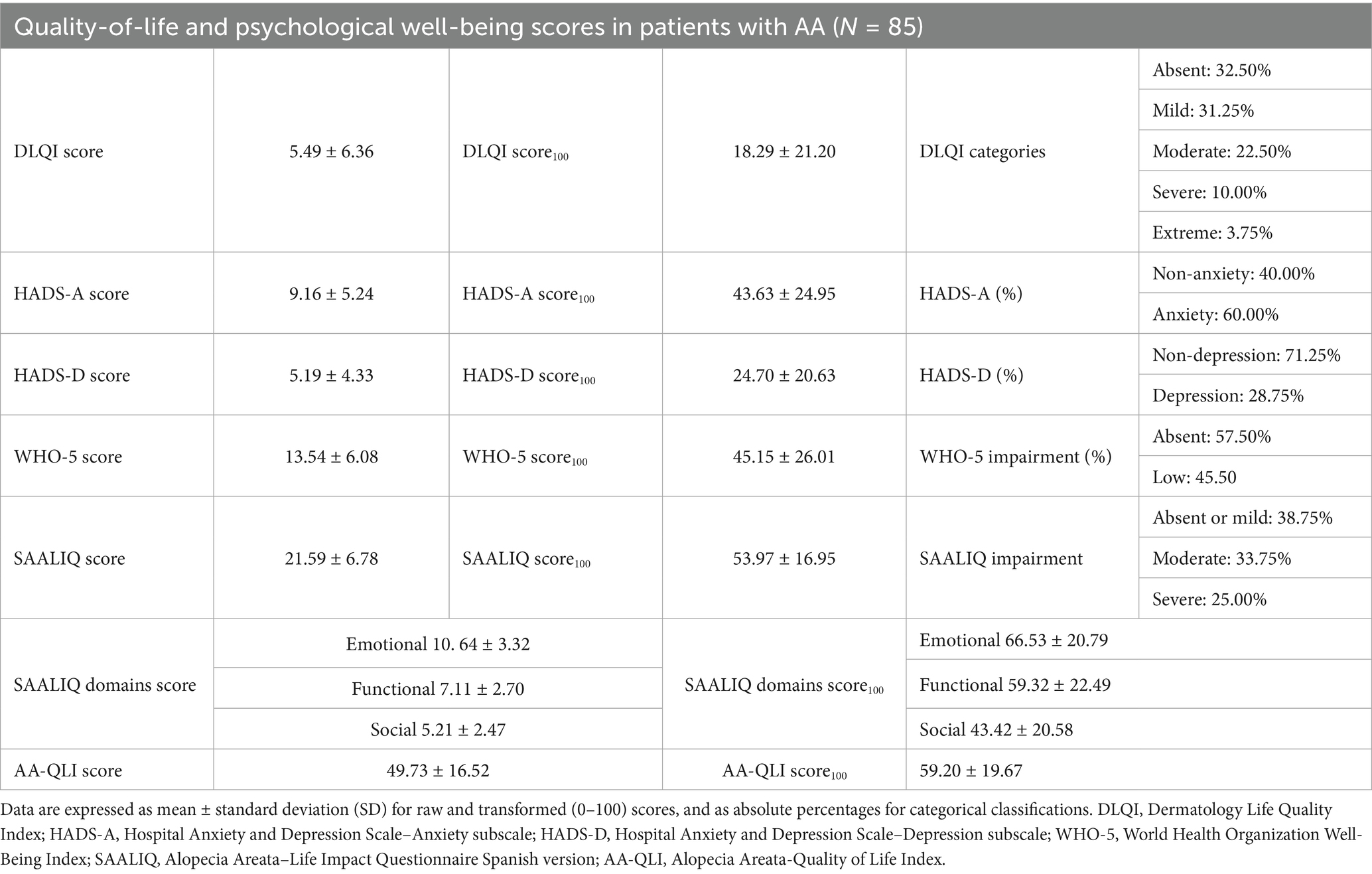 In the study population, the mean DLQI score was 5.49 ± 6.36, with 32.5% of patients reporting no impact on QoL, 31.25% mild impact, and 36.25% moderate-to-extreme impact. The mean HADS-A score was 9.16 ± 5.24, with 60% of participants presenting anxiety symptoms. The mean HADS-D score was 5.19 ± 4.33, with depressive symptoms identified in 28.75% of cases. The WHO-5 Well-Being Index mean score was 13.54 ± 6.08, with 42.5% of patients exhibiting low well-being. The mean SAALIQ score was 21.59 ± 6.78, with 61.25% of participants showing moderate-to-severe disease-specific quality-of-life impairment. When analyzing the SAALIQ by domains, the highest mean raw score corresponded to the emotional domain (10.64 ± 3.32), followed by the functional (7.11 ± 2.70) and social domains (5.21 ± 2.47). The mean original AA-QLI score was 49.73 ± 16.52. Scores were also standardized to a 0–100 scale to enable comparability in subsequent analyses (details can be seen in Table 2).