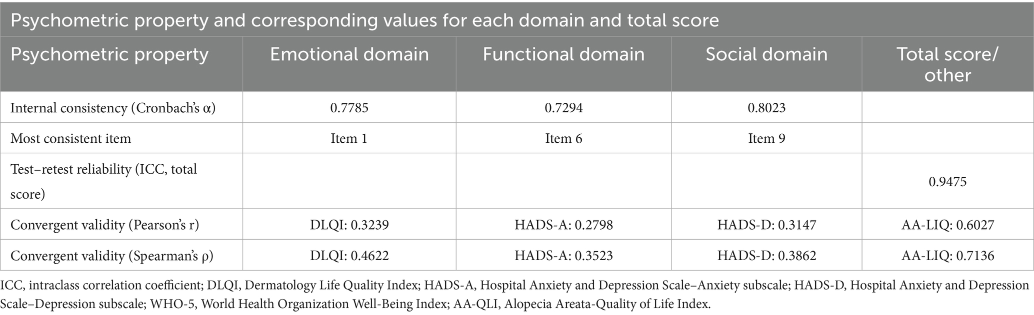 Reliability was evaluated through internal consistency and temporal stability. Internal consistency, assessed using Cronbach’s α for each of the three domains, yielded values of 0.7785 for the emotional domain, 0.7294 for the functional domain, and 0.8023 for the social domain. The most internally consistent items within each domain were items 1, 6, and 9, respectively. Temporal stability was examined in a subsample of 25 patients with AA using ICC between test and retest administrations, with an interval of 30 days. The ICC for the total score was 0.9475, indicating excellent reproducibility, with no significant changes observed that could be attributed to ongoing treatment during this period (details can be seen in Table 3).