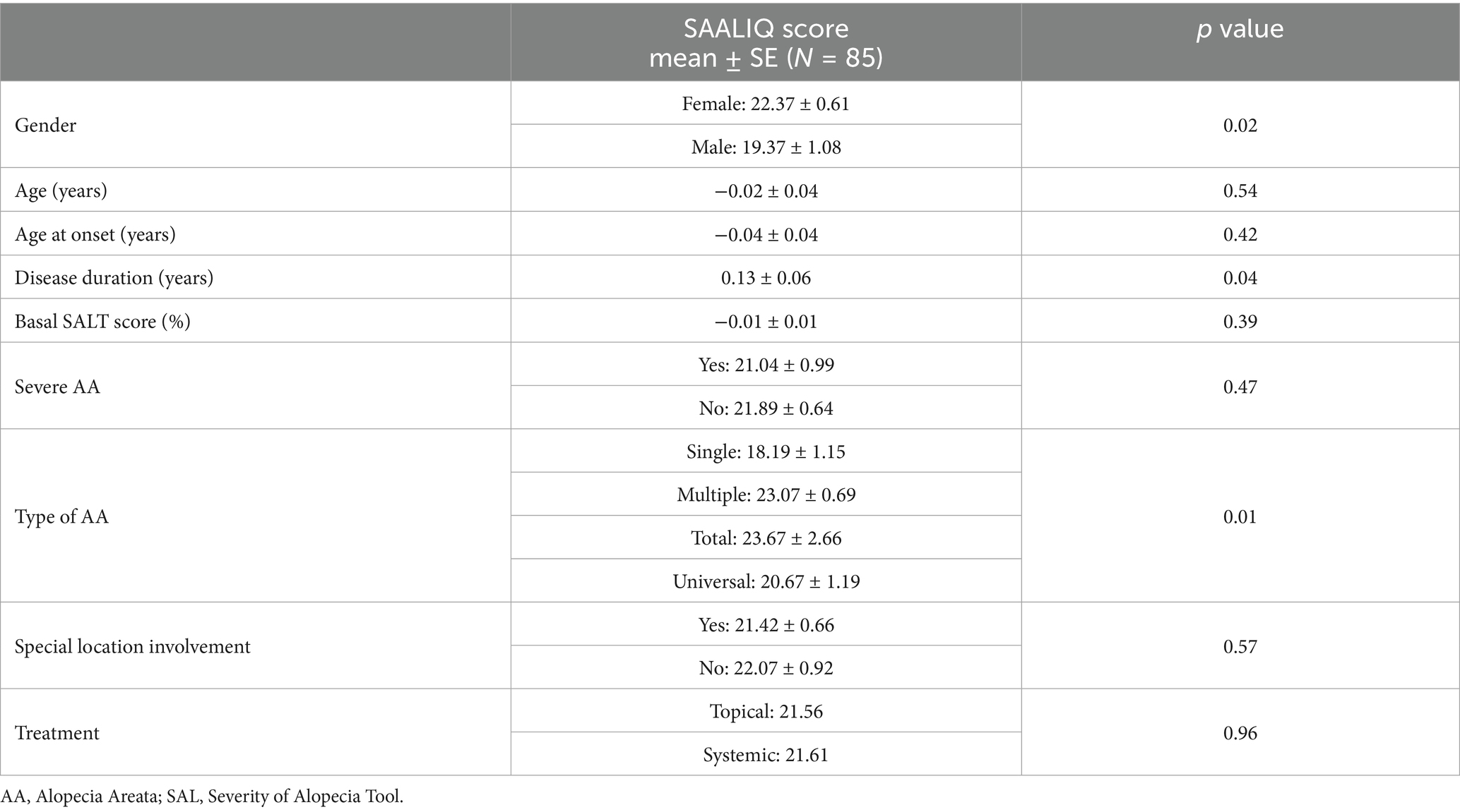 Criterion validity was explored by assessing associations between SAALIQ scores and sociodemographic or clinical variables. Univariate analysis showed significantly higher mean scores in females than in males (p = 0.02) and in patients with multiple-type and AAT compared with single-type AA (23.07 ± 0.69 vs. 18.19 ± 1.15). Longer disease duration was also positively associated with higher scores (coefficient = 0.13 ± 0.06; p = 0.04). No significant associations were found with age, age at onset, baseline SALT score, overall disease severity, or special site involvement (all p > 0.05; details can be seen in Table 4).
