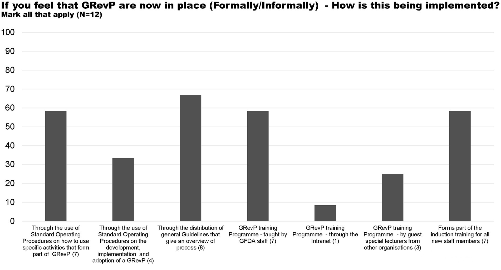 All of the 12 study participants believed that GRevPs are being implemented by the Authority either formally or informally (Figure 1). This is being done through the distribution of general guidelines that give an overview of the process, through the use of standard operating procedures on how to use specific activities that form part of the GRevP, as well as the GRevP training programme taught by ZAMRA staff and that it forms part of the induction training for all new staff members.