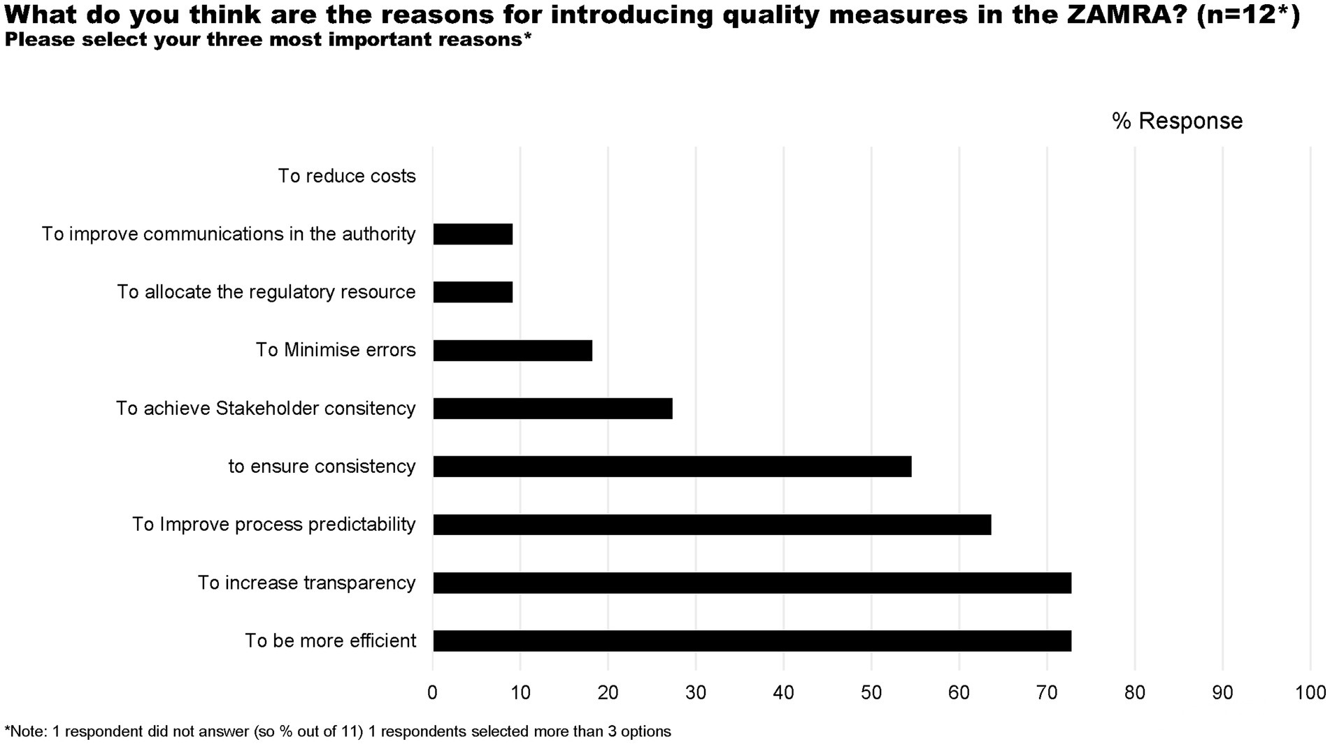 Respondents provided details indicating the reasons for introducing quality measures in ZAMRA. The three most common reasons were to increase transparency, be more efficient and improve process predictability.