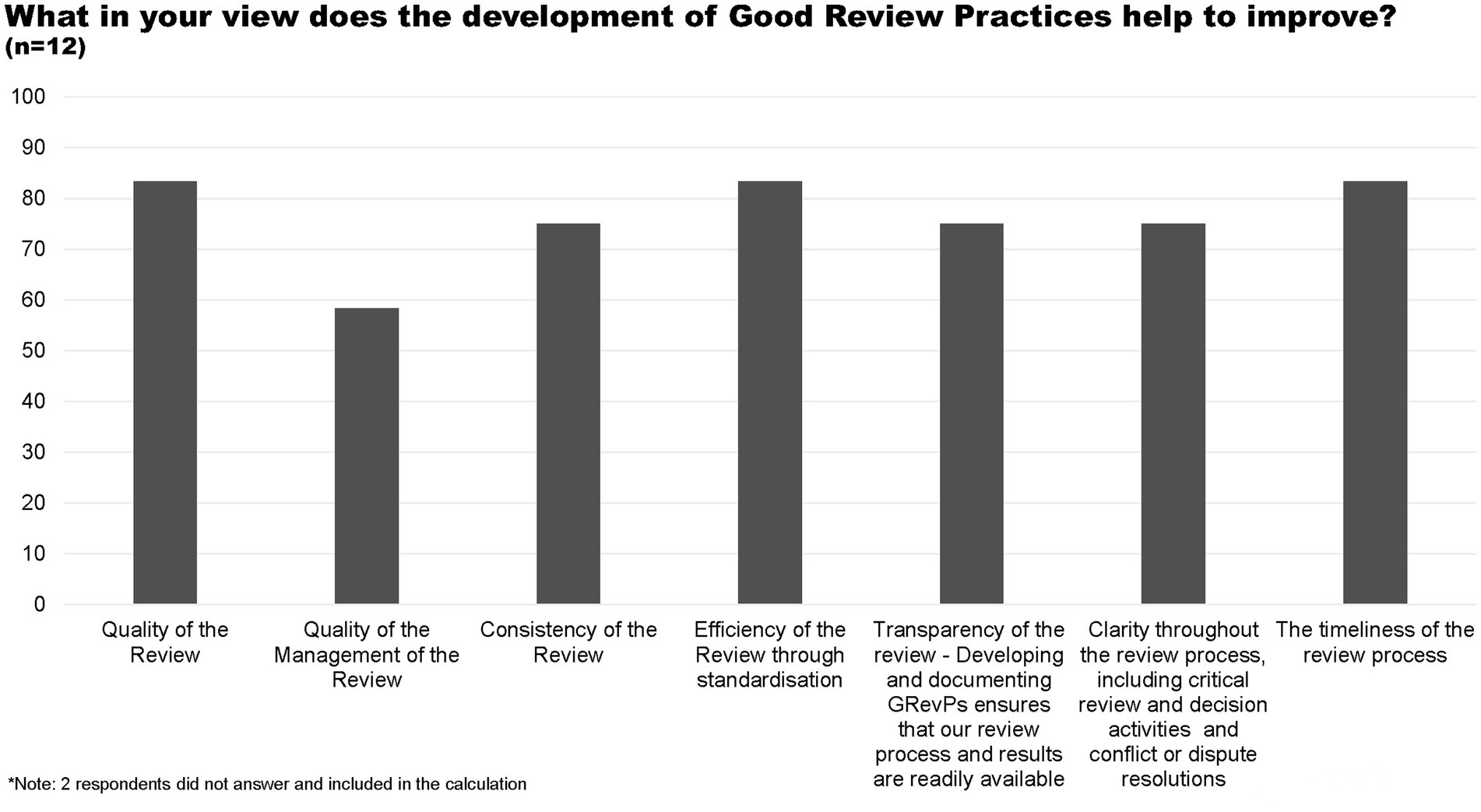 Most of the respondents believe that the development of GRevP helps to improve the quality and timelines of the review, efficiency of the review through standardisation, consistency of the review, transparency, and clarity throughout the review (Figure 3).