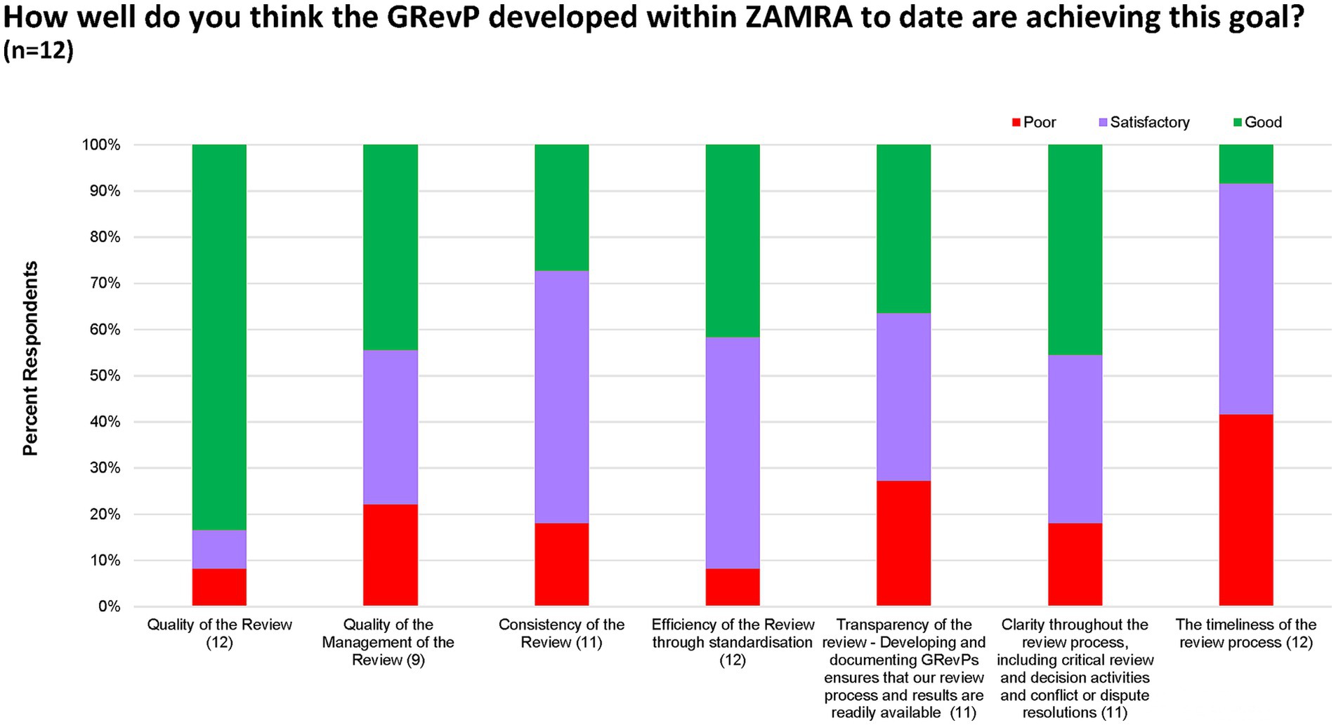 When asked whether the GRevPs developed within ZAMRA were achieving their intended purpose, study participants provided insights concerning the quality, consistency, transparency and timeliness of reviews. Concerning the quality of the review, 10 (84%) participants rated this as good and 1 (8%) satisfactory, or 1 (8%) poor. Management quality was considered good by 5 (44%), satisfactory by 4 (34%), and poor by 3 (22%) of participants. Regarding consistency, 7 (54%) respondents rated it as satisfactory, 3 (28%) respondents rated as good, and 2 (18%) respondents rated as poor, indicating the need for improvement. Efficiency through standardisation was a noted concern with half of the respondents (50%) stating that this required improvement, 5 (42%) respondents rated it as good, and 1 (8%) as poor. Transparency was seen as good by 4 (36%) respondents, satisfactory by another 4 (36%) respondents, and poor by 3 (28%), highlighting room for greater openness in the process. Clarity of the review process was viewed positively by 9 (82%) respondents, while 2 (18%) indicated it was lacking. In contrast, timeliness emerged as a key weakness with only 5 (41%) of study participants indicating this practice as good, 4 (32%) as satisfactory, and 2 (18%) as poor (Figure 4).