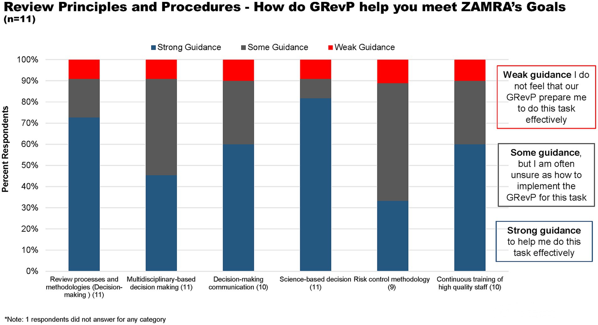 With regard to review principles and procedures, over 72 and 82% of respondents believed that ZAMRA gives strong guidance to help them do their task through review processes and methodologies, and science-based decisions, respectively (Figure 5). Furthermore, 42 and 55% believed that the Authority gives some guidance through multidisciplinary-based decision-making and risk-control methodology but are unsure as to how to implement the GRevP (Figure 5).