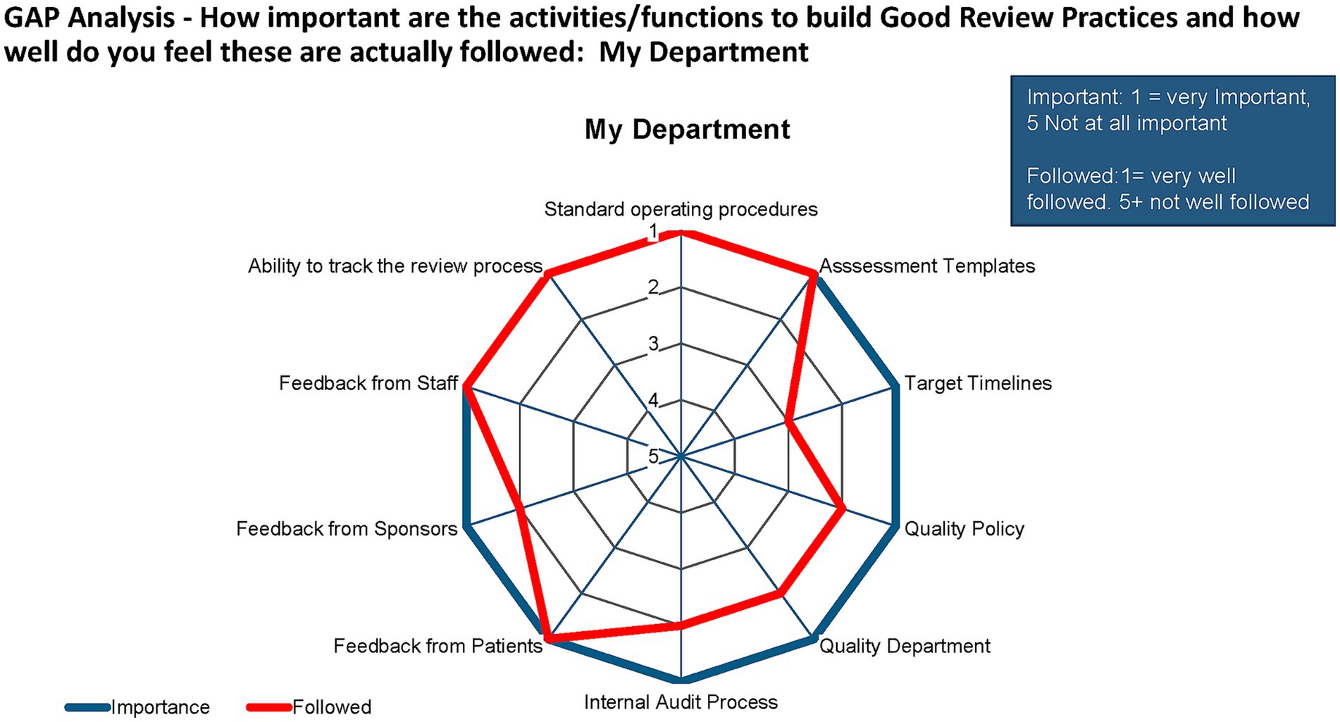 A gap analysis of the importance of GRevPs for the department/individual and how closely these were followed up showed that the study participants perceived that all aspects of GRevPs were important. However, the internal audit process, quality department, quality policy, target timelines, assessment templates, feedback from patients, and staff were considered to be very important (Figure 7).