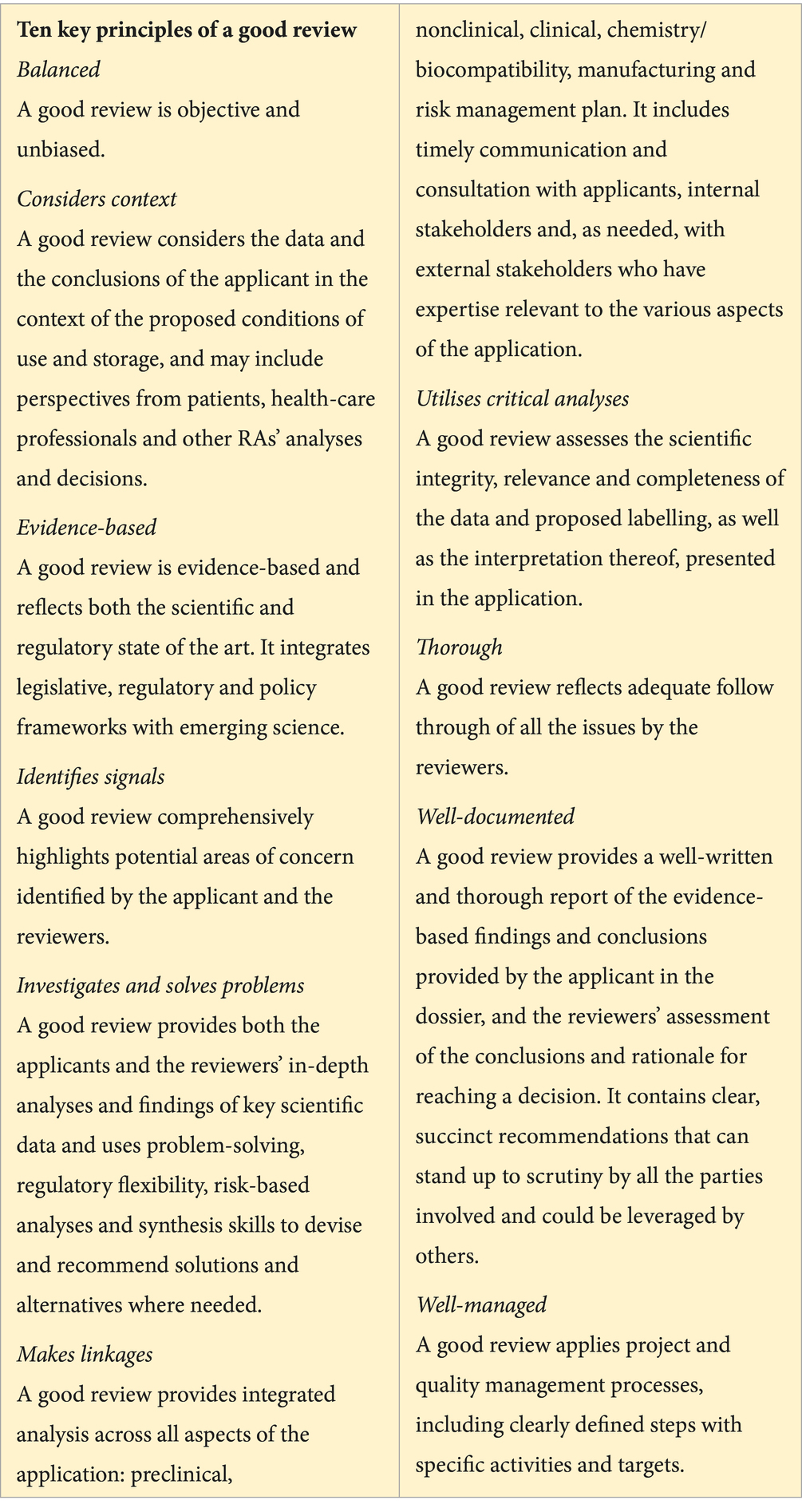 Good Review Practices (GRevPs) are defined as ‘documented evidence of any aspect of the process, format, content, and management of the regulatory review’ and they form an integral part of the review process (11). These practices were developed to achieve timeliness, predictability, consistency, transparency, clarity, efficiency and high quality in the content and management of the reviews (12), in so doing standardising the review process (11). All this is achieved through the development of the guidelines, standard operating procedures, evaluation templates, staff training and orientation packages, and having quality decision-making frameworks (13). Others include established target times, parallel dossier assessment, and continuous improvement processes (11). These are considered as the building blocks of the quality review process (13). A good review is balanced, considers context, is evidence based, identifies signal, investigates and solves problem, makes linkages, utilises critical analyses, is thorough, well-documented and well managed (11).