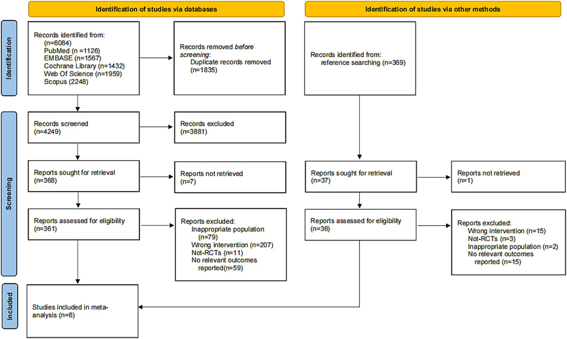 Primary database searches yielded 6,084 unique articles for title and abstract screening. After removing duplicates, 4,249 articles were screened; 361 full-text articles were retrieved, of which 356 were excluded after evaluation. A manual search of other sources (e.g., backward and forward citation searches) identified 369 records, yielding one additional included article. Finally, following the inclusion criteria, six articles (12, 21–25) were considered eligible for inclusion in the meta-analysis.