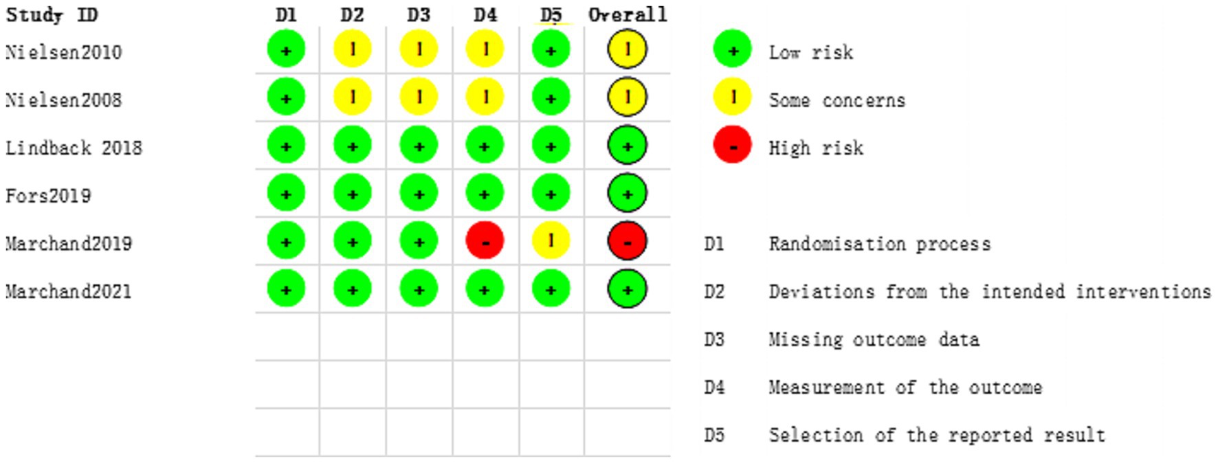 Risk of bias was assessed using the Cochrane Risk of Bias Tool Version 2 (RoB 2) (19), which includes domains such as the randomization process, intended interventions, missing outcome data, measurement of the outcome, and selection of the reported result. Each trial was assessed across these five bias domains, yielding both a summary risk-of-bias score for each domain and an overall classification (low risk, some concerns, or high risk of bias). Furthermore, two authors assessed each of the included studies, and each potential source of bias was graded as high, low, or unclear risk of bias, and two reviewers independently performed the assessment. Discrepancies were resolved by consensus or, if needed, through discussion with the research team.