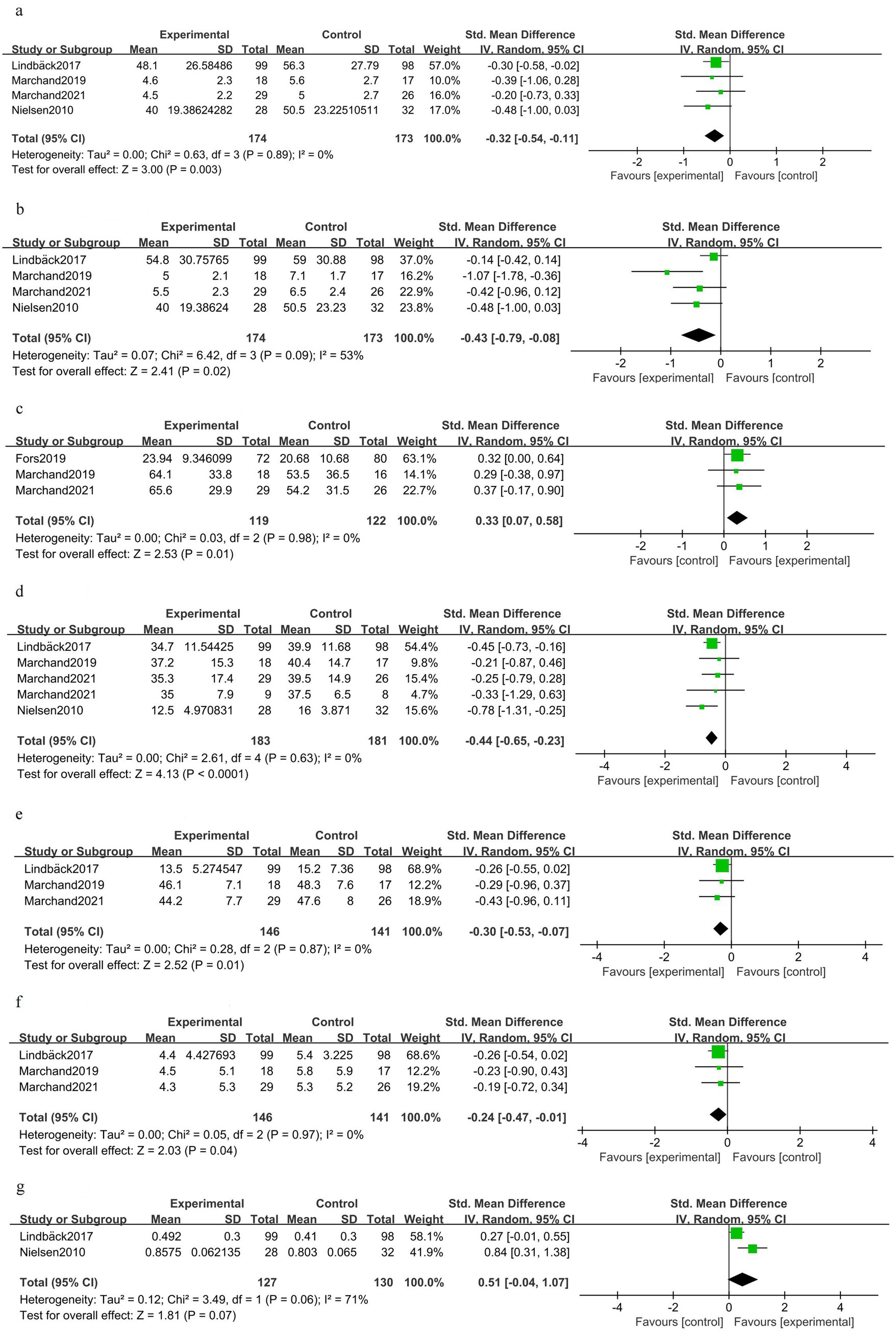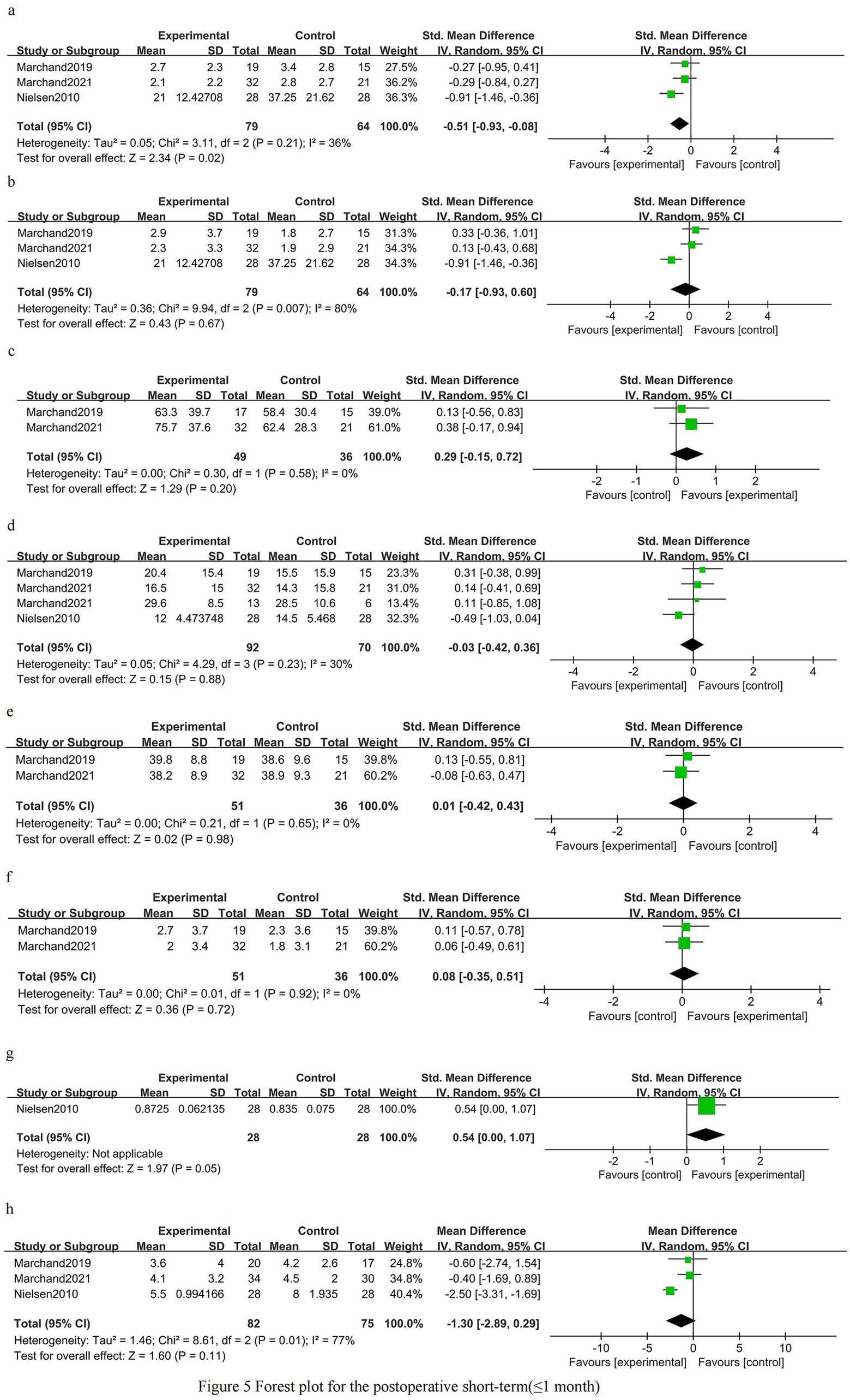 Back pain in the early postoperative period was improved in patients who received prehabilitation [SMD −0.51 (95% CI −0.93 to −0.08); three trials, 143 patients; I2 36%; GRADE: Moderate] (Figure 5a). There was no clear early postoperative benefit for leg pain [SMD −0.17 (95% CI −0.93 to 0.60); three trials, 143 patients; I2 80%; GRADE: Low] (Figure 5b). Early postoperative knee extensor strength showed a non-significant trend favoring prehabilitation [SMD 0.29 (95% CI −0.15 to 0.72); two trials, 85 patients; I2 0%; GRADE: Moderate] (Figure 5c). Overall disability scores did not differ significantly in the early postoperative period [SMD −0.03 (95% CI −0.42 to 0.36); three trials, 162 patients; I2 30%; GRADE: Moderate] (Figure 5d). Kinesiophobia was unchanged shortly after surgery [SMD 0.01 (95% CI −0.42 to 0.43); two trials, 87 patients; I2 0%; GRADE: Moderate] (Figure 5e). Depressive symptoms showed no clear early postoperative difference [SMD 0.08 (95% CI −0.35 to 0.51); two trials, 87 patients; I2 0%; GRADE: Moderate] (Figure 5f). One trial reported improved early postoperative health-related quality of life [SMD 0.54 (95% CI 0.00–1.07); one trial, 56 patients] (Figure 5g). Length of hospital stay was shorter on average in the prehabilitation group, but the difference did not reach statistical significance [MD −1.30 days (95% CI −2.89 to 0.29); three trials, 157 patients; I2 77%; GRADE: Low] (Figure 5h).