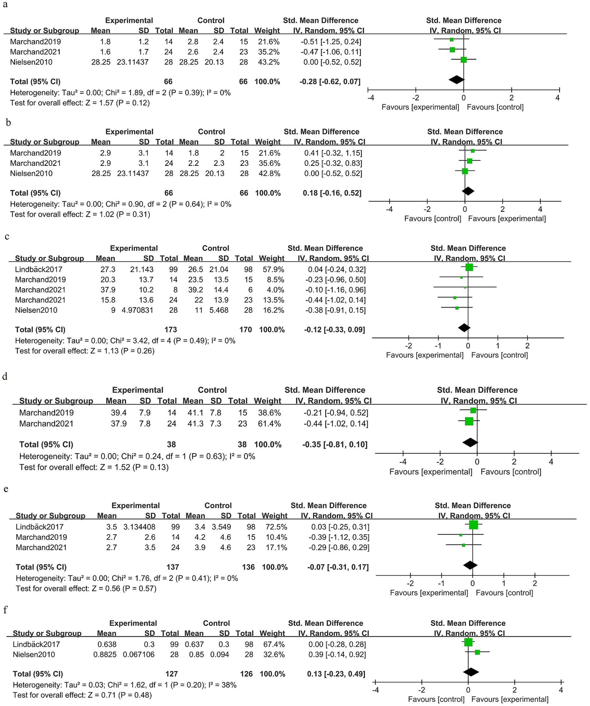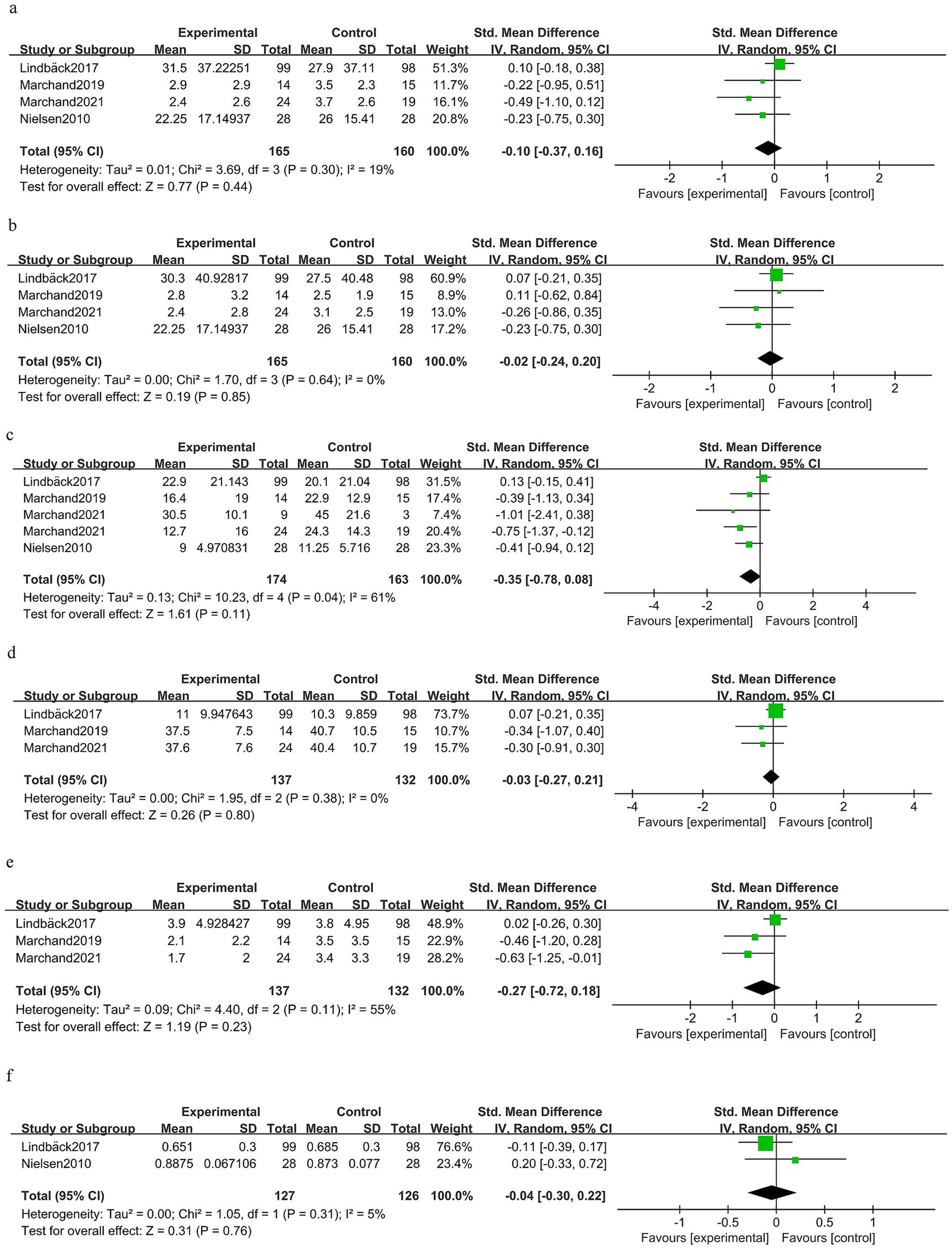 At 1–6 months after surgery, there was no clear benefit of prehabilitation for back pain [SMD −0.28 (95% CI −0.62 to 0.07); three trials, 132 patients; I2 0%; GRADE: Moderate] (Figure 6a). Leg pain at 1–6 months was similar between the groups [SMD 0.18 (95% CI −0.16 to 0.52); three trials, 132 patients; I2 0%; GRADE: Moderate] (Figure 6b). Disability measured in the intermediate postoperative period did not differ significantly between the groups [SMD −0.12 (95% CI −0.33 to 0.09); four trials, 343 patients; I2 0%; GRADE: Moderate] (Figure 6c). Kinesiophobia showed a non-significant difference favoring prehabilitation [SMD −0.35 (95% CI −0.81 to 0.10); two trials, 76 patients; I2 0%; GRADE: Moderate] (Figure 6d). Depressive symptoms were not significantly different at 1–6 months [SMD −0.07 (95% CI −0.31 to 0.17); three trials, 273 patients; I2 0%; GRADE: Moderate] (Figure 6e). Health-related quality of life did not differ at intermediate follow-up [SMD 0.13 (95% CI −0.23 to 0.49); two trials, 253 patients; I2 38%; GRADE: Moderate] (Figure 6f).