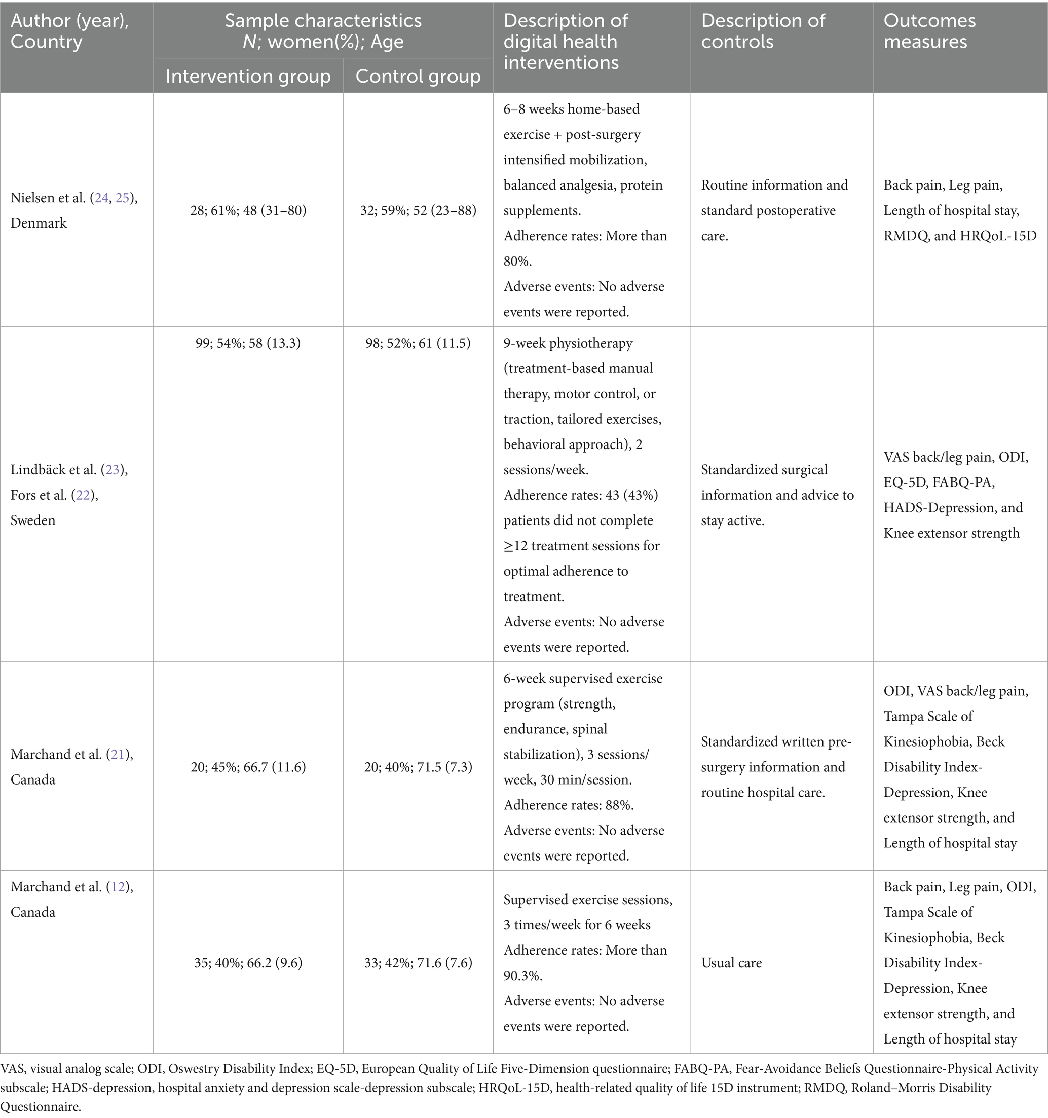 In total, four RCTs reported across the six studies met the inclusion criteria, enrolling a total of 365 participants. The trials were conducted in Denmark (24, 25), Sweden (22, 23), and Canada (12, 21). Detailed descriptive characteristics are presented in Table 1. Reported mean ages by study group ranged approximately from 48.0 to 71.6 years across the trials. All included trials evaluated exercise-based prehabilitation delivered either as supervised outpatient sessions (12, 21–23) or home-based programs (24, 25) with therapist instructions. Common intervention elements across the trials included progressive strengthening and endurance exercises, spinal stabilization/motor-control training, individually tailored exercise prescriptions, and a behavioral/activation component in one study (23). Overall, the program dose most commonly comprised 2–3 sessions per week, with a total program duration of approximately 6–9 weeks. Control groups received usual care or standardized preoperative information and routine postoperative management. Pain and function were assessed using visual analog scales for back/leg pain (21, 23), the Oswestry Disability Index (ODI) (12, 21, 23), and the Roland–Morris Disability Questionnaire (RMDQ) in at least one trial (24). Health-related quality of life (HRQoL) was assessed using the European Quality of Life 5-Dimension (EQ-5D) (23) and the HRQoL-15D instrument (24). Psychological measures were reported using the Hospital Anxiety and Depression Scale (HADS) (23), the Beck Disability Index-Depression (12, 21), the Tampa Scale of Kinesiophobia (12, 21), and the Fear-Avoidance Beliefs Questionnaire-Physical Activity subscale (FABQ-PA) (23). Objective physical performance (knee extensor strength) (12, 21, 22) and health-service metrics (length of hospital stay) (12, 21, 24) were also reported in selected trials.