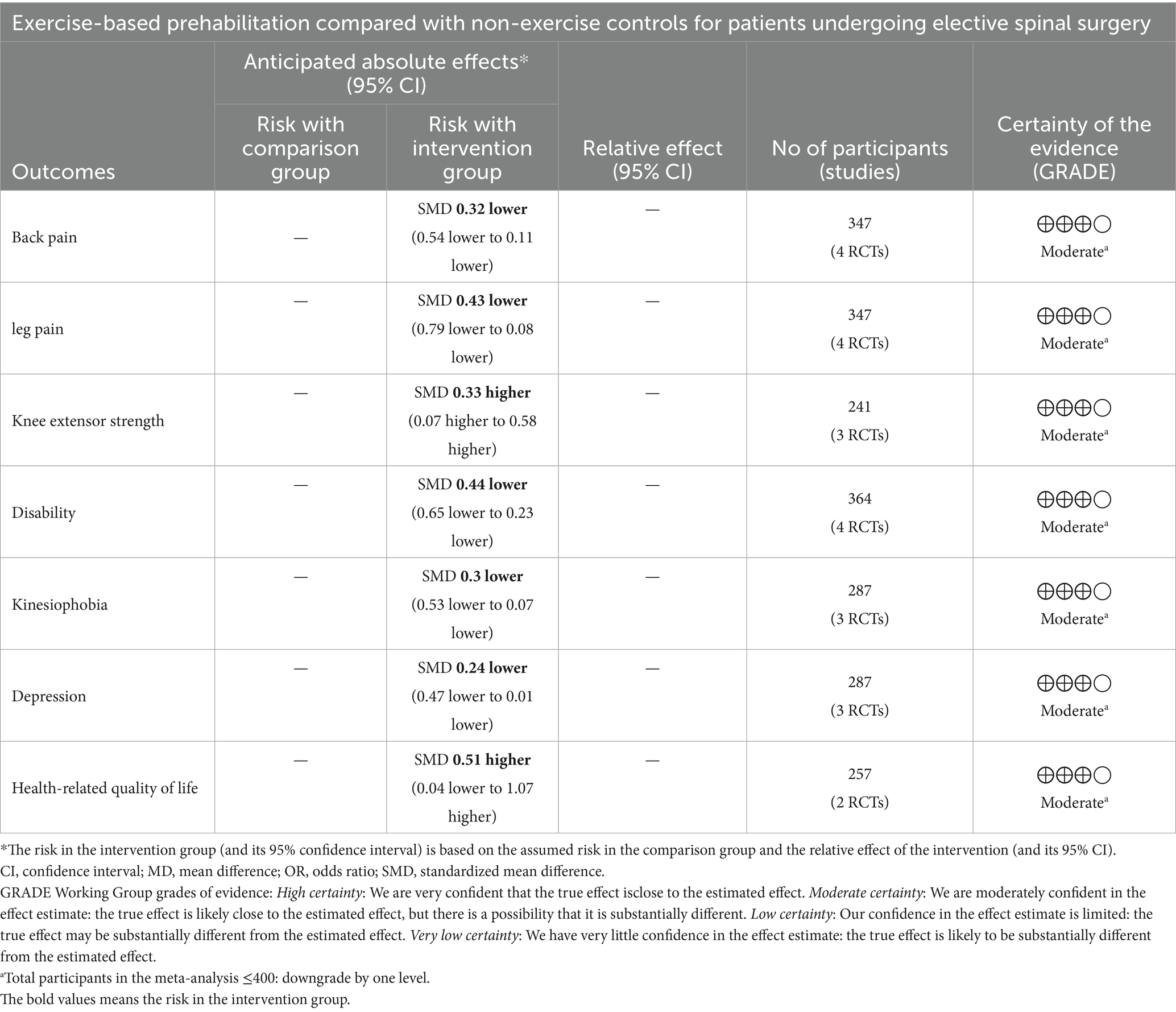 To the best of our knowledge, no comprehensive systematic review with meta-analysis has concurrently evaluated the efficacy of exercise-based prehabilitation on preoperative and postoperative outcomes in patients undergoing elective spinal surgery. Accordingly, we performed a systematic review and meta-analysis of RCTs comparing exercise-based prehabilitation with non-exercise controls in adults scheduled to undergo elective spinal surgery to address this evidence gap and provide evidence-based recommendations for clinical practice and future research.