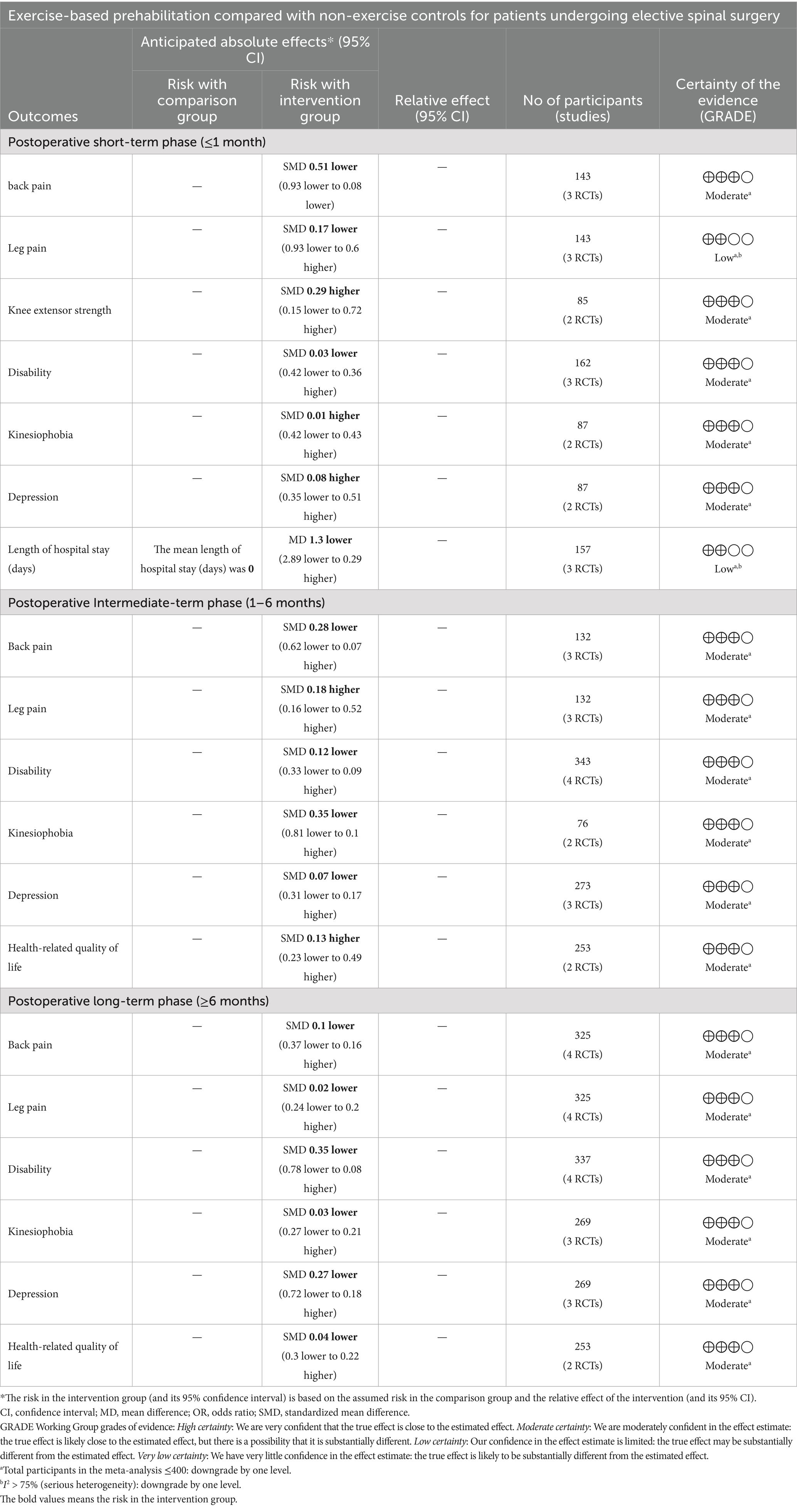 Conclusion: Exercise-based prehabilitation provides consistent small-to-moderate standardized benefits for most preoperative outcomes and shows a favorable signal for early postoperative back pain in adults undergoing elective spinal surgery. However, evidence for sustained intermediate- and long-term postoperative improvements is not established with current data.
