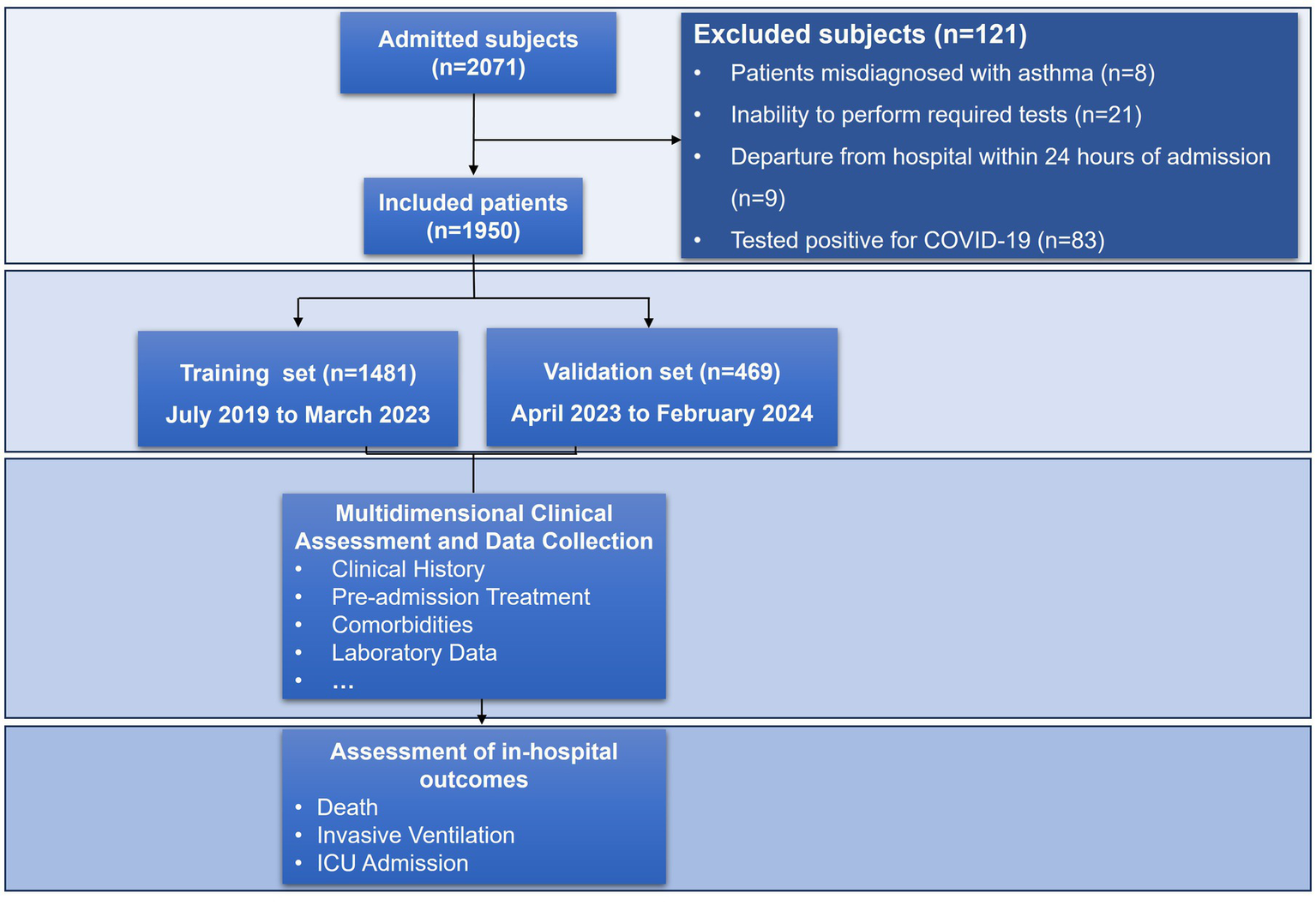This prospective cohort study consecutively enrolled adult patients (≥18 years) hospitalized for unplanned asthma exacerbations at West China Hospital, Sichuan University between July 2019 and February 2024. Asthma diagnosis was confirmed through documented airflow variability alongside characteristic respiratory symptoms, as per GINA guidelines (2). Exclusion criteria included misdiagnosis (confirmed by post-hoc specialist review), inability to complete essential tests, hospital stays <24 h, and active COVID-19 infection. To avoid misclassification with COPD and other chronic airway diseases, we excluded patients with a prior COPD diagnosis, a post-bronchodilator FEV₁/FVC below the lower limit of normal, or clinical/imaging findings suggestive of alternative chronic airway pathology. All patients received standardized GINA-based management, as previously detailed (2, 30), including systematic biomarker profiling and daily clinical monitoring until discharge. The cohort was divided into temporally distinct training (July 2019–March 2023; n = 1,481) and internal validation (April 2023–February 2024; n = 469) sets to, respectively, develop and validate the AORI-HAP model. The study protocol (IRB no. 425) was approved by the hospital’s ethics committee, with written informed consent obtained from all patients.