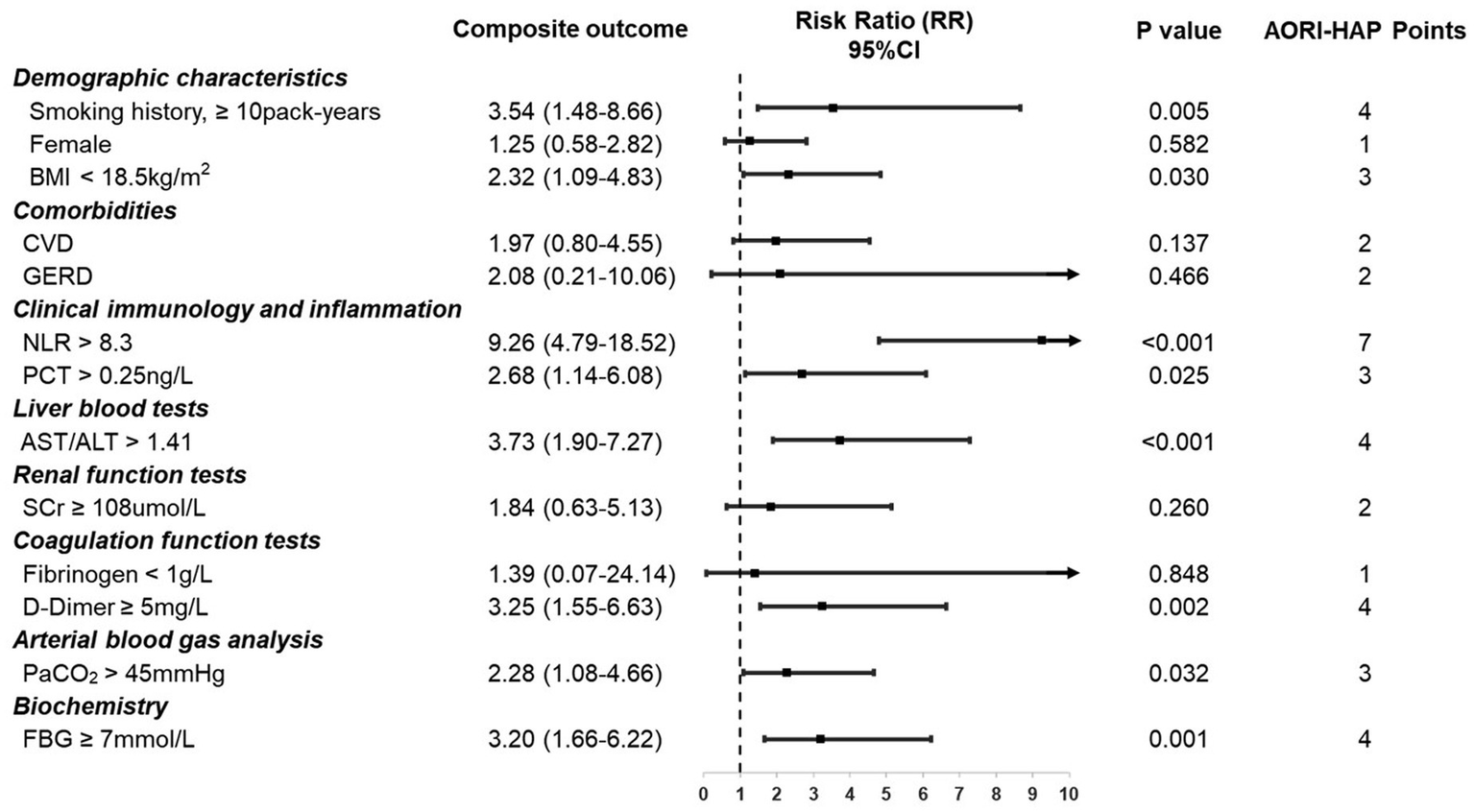 Figure 3. Indicators in multidimensional assessment and associated points in AORI-HAP for predicting composite outcome in hospitalized patients with asthma exacerbations (AE) (n = 1,481). Relative risk (RR) represents the strength of the association between each indicator and the composite outcome. AORI-HAP Points: points were assigned based on the indicator’s influence on the composite outcome, to evaluate the patient’s overall risk level. ALT, alanine aminotransferase; AST, aspartate aminotransferase; BMI, body mass index; CVD, cardiovascular disease; FBG, fasting blood glucose; GERD, gastroesophageal reflux disease; NLR, neutrophil-to-lymphocyte ratio; PCT, procalcitonin; PaCO2, partial pressure of carbon dioxide; SCr, serum creatinine.