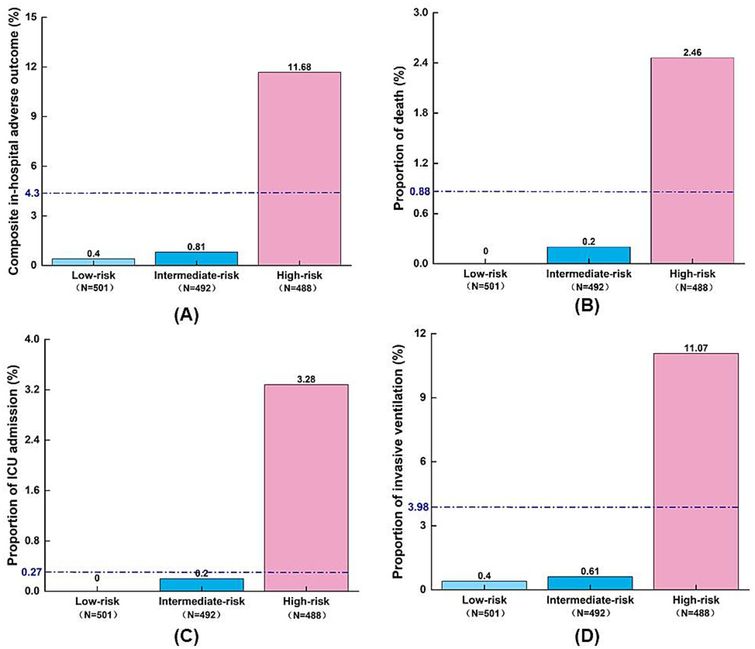 Figure 4. Distribution of adverse outcomes by AORI-HAP risk groups in the training set (n = 1,481). (A) Composite in-hospital adverse outcome; (B) Death; (C) ICU admission; (D) Invasive ventilation. The blue dashed line indicates the overall incidence of adverse outcomes in the training set population, irrespective of risk group stratification. ICU, intensive care unit.