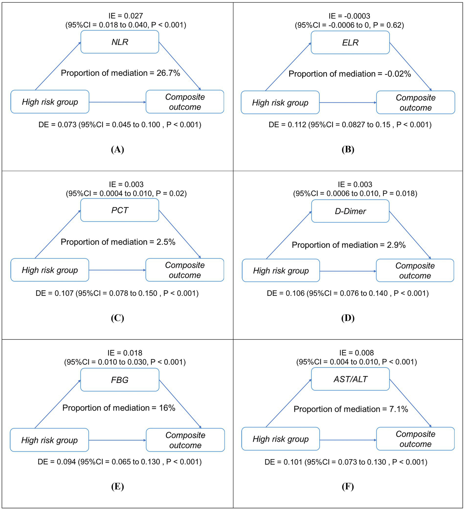 Figure 5. Simplified mediation pathways between high-risk status (reference: low-risk group) and in-hospital composite outcome in patients with asthma exacerbations (AE) (n = 1,481). Panels (A–F) show mediation models for (A) NLR, (B) ELR, (C) PCT, (D) D-dimer, (E) FBG, and (F) AST/ALT. Each diagram illustrates both the direct effect (DE) of high-risk status on adverse outcomes and the indirect (mediated) effect (IE) transmitted through the mediator, along with their 95% confidence intervals. The proportion mediated (%) represents the share of total effect explained by each mediator. All models were adjusted for age and sex. IE, indirect effect; DE, direct effect; NLR, neutrophil-to-lymphocyte ratio; ELR, eosinophil-to-lymphocyte ratio; PCT, procalcitonin; AST/ALT, aspartate aminotransferase/alanine aminotransferase; FBG, fasting blood glucose. ***p < 0.001, *p < 0.01.