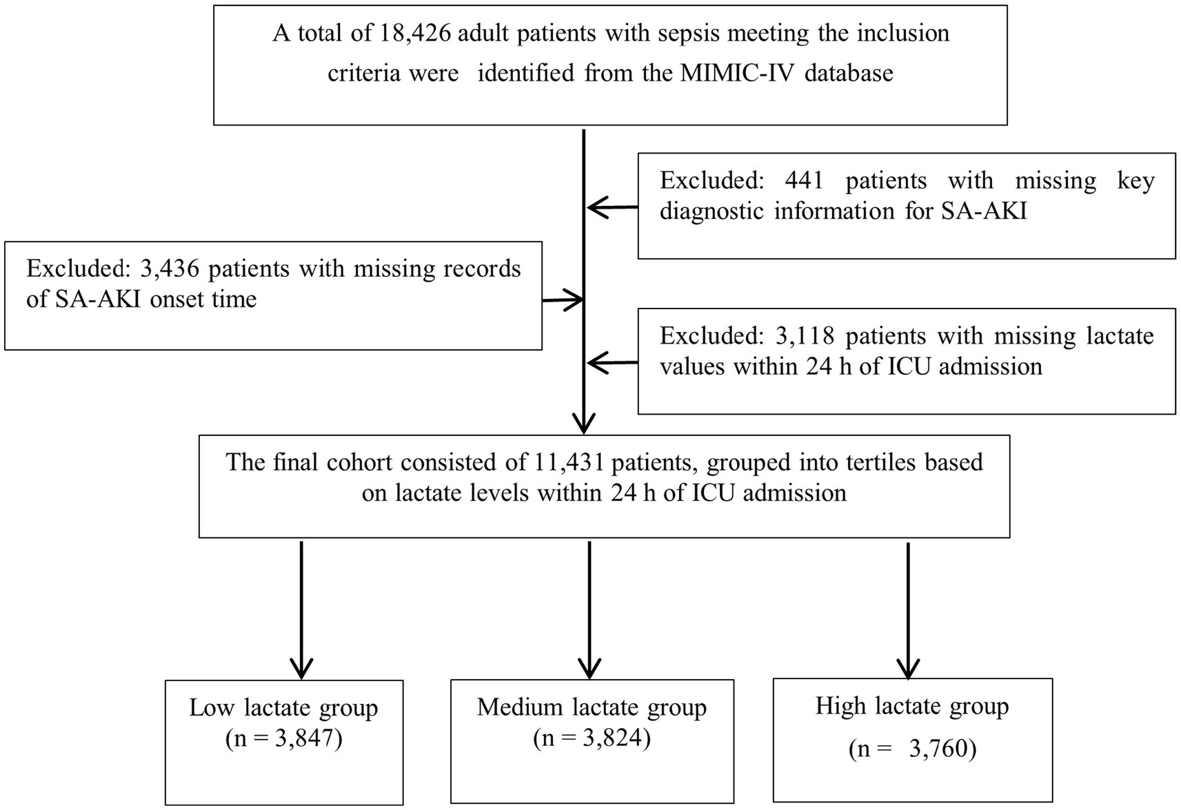 Flowchart depicting patient selection from the MIMIC-IV database. Starting with 18,426 adult sepsis patients, 3,436 were excluded due to missing SA-AKI onset time records, 441 for missing diagnostic info, and 3,118 for missing lactate values. The final cohort of 11,431 patients was grouped into low (3,847), medium (3,824), and high (3,760) lactate groups based on levels within 24 hours of ICU admission.