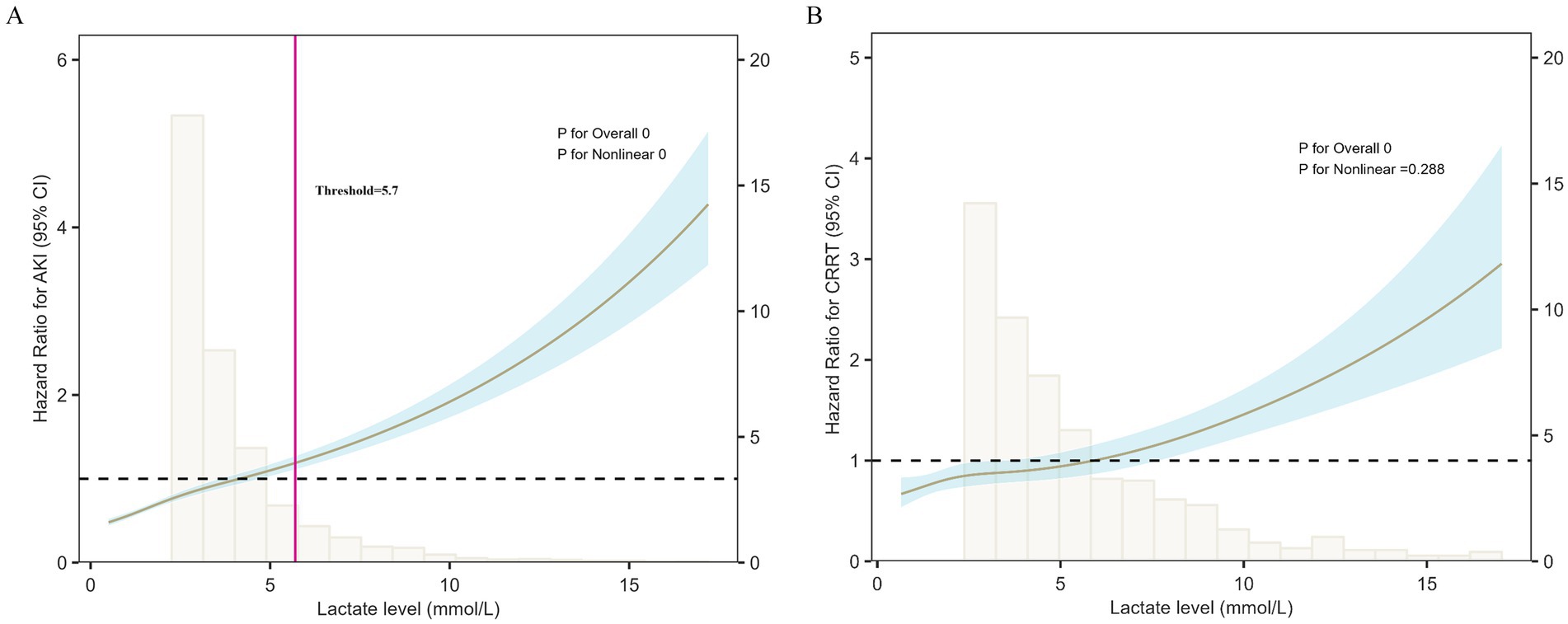 Figure 3. Restricted cubic spline (RCS) analysis of lactate levels and renal outcomes. (A) Lactate levels showed a nonlinear association with SA-AKI risk (overall p < 0.001, nonlinearity p < 0.001). The risk increased slowly at lower levels but rose sharply when lactate exceeded ~5.7 mmol/L, marking an inflection point that may represent a threshold for metabolic decompensation and sharply elevated SA-AKI risk. (B) Lactate levels were significantly associated with the risk of CRRT (p < 0.001), with an approximately linear increase across the range. Shaded areas represent 95% confidence intervals.