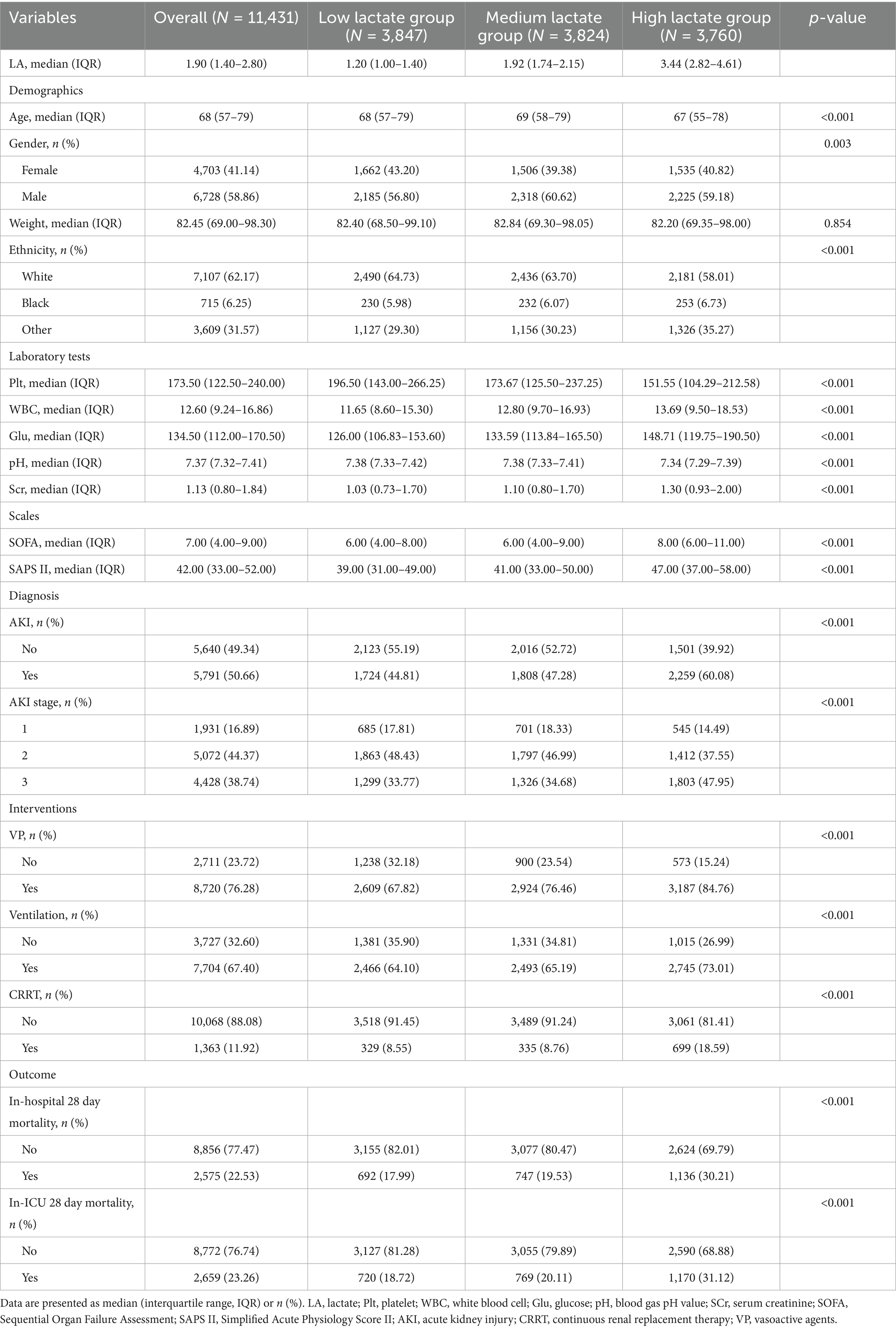 A total of 11,431 patients with sepsis were included in this study, of whom 6,728 (58.9%) were male, with a median age of 68 years (IQR: 57–79 years). Based on lactate levels within the first 24 h of ICU admission, patients were stratified into tertiles: the low lactate group [1.20 (1.00–1.40) mmol/L, n = 3,847], the medium lactate group [1.92 (1.74–2.15) mmol/L, n = 3,824], and the high lactate group [3.44 (2.82–4.61) mmol/L, n = 3,760] (Table 1). Compared with the low lactate group, patients in the high lactate group were younger, with a higher proportion of males and non-White individuals. As lactate levels increased, platelet counts decreased, while white blood cell counts, blood glucose, and serum creatinine levels progressively increased, accompanied by a decline in arterial pH. Both SOFA and SAPS II scores increased stepwise across the tertiles. Furthermore, the incidence and severity of AKI were significantly higher in the high lactate group, along with increased use of vasoactive agents (VP), mechanical ventilation, and CRRT. The 28-day in-hospital and ICU mortality rates were also markedly elevated in the high lactate group (all p < 0.01). Overall, higher lactate levels were closely associated with greater disease severity, an increased risk of SA-AKI, and worse clinical outcomes.