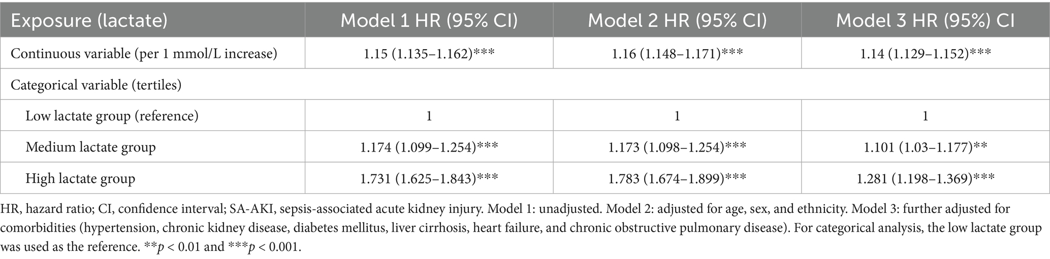 Cox proportional hazards regression models were applied to evaluate the association between lactate levels and the risk of SA-AKI. Univariate Cox regression was first conducted to screen potential confounders. Subsequently, three multivariable models were constructed: Model 1, unadjusted; Model 2, adjusted for age, sex, and ethnicity; and Model 3, further adjusted for comorbidities including hypertension, chronic kidney disease, diabetes mellitus, liver cirrhosis, heart failure, and chronic obstructive pulmonary disease. Results were reported as hazard ratios (HRs) with 95% confidence intervals (CIs).