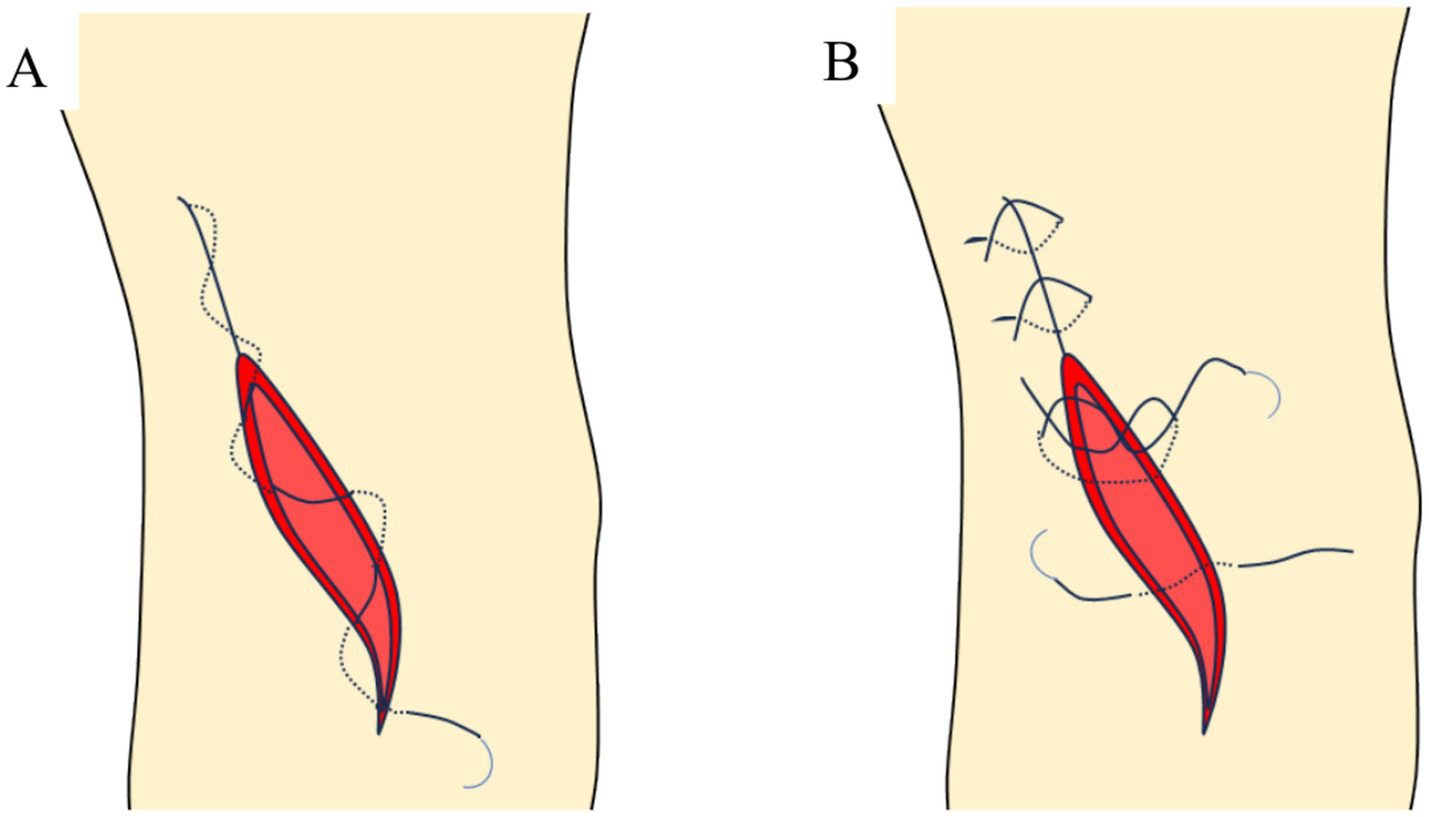 Figure 2. Schematic diagram of incision suture methods. (A) Continuous intradermal suture; (B) traditional intermittent suture.