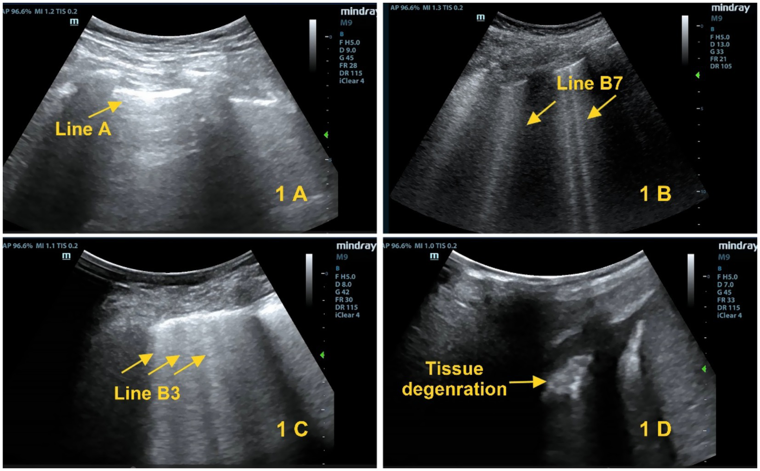 (1) Score 0: Pleural sliding sign with A-line visualization (Figure 1A); (2) Score 1: B7-line sign (B-line spacing of 7 mm, Figure 1B); (3) Score 2: B3-line sign (B-line spacing of 3 mm, Figure 1C); (4) Score 3: Shred sign/tissue-like change (Figure 1D). A 12-lung-zone (6 zones on each side) scanning method is used, and the total score ranges from 0 to 36 points (6).