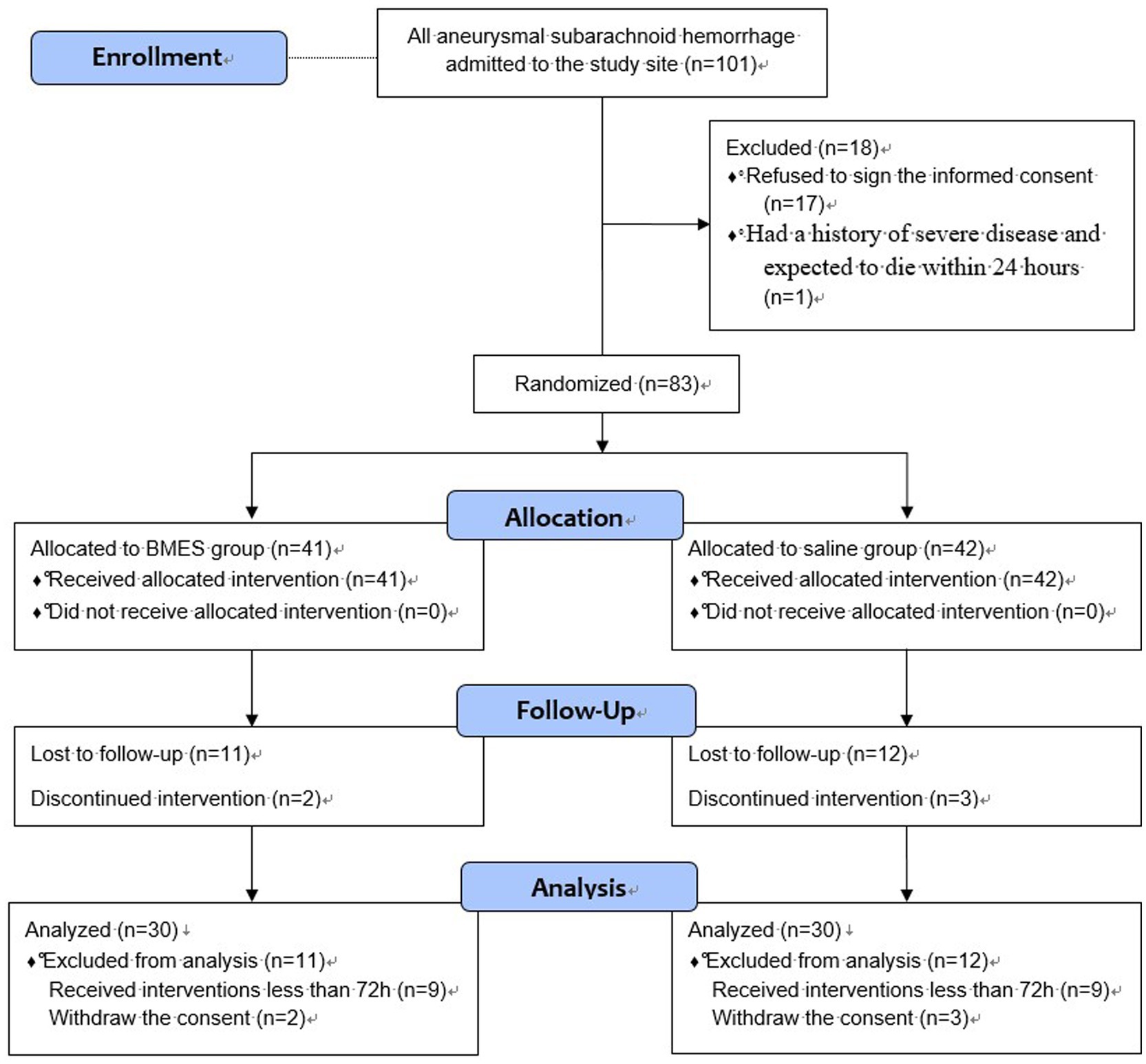 Flowchart depicting the process of a study on aneurysmal subarachnoid hemorrhage. Enrollment included 101 patients; 18 were excluded. Eighty-three participants were randomized into two groups: BMES (41) and saline (42). Follow-up showed losses with 11 from BMES and 12 from saline. Analysis included 30 from each group, with exclusions noted for duration of intervention and withdrawal of consent.