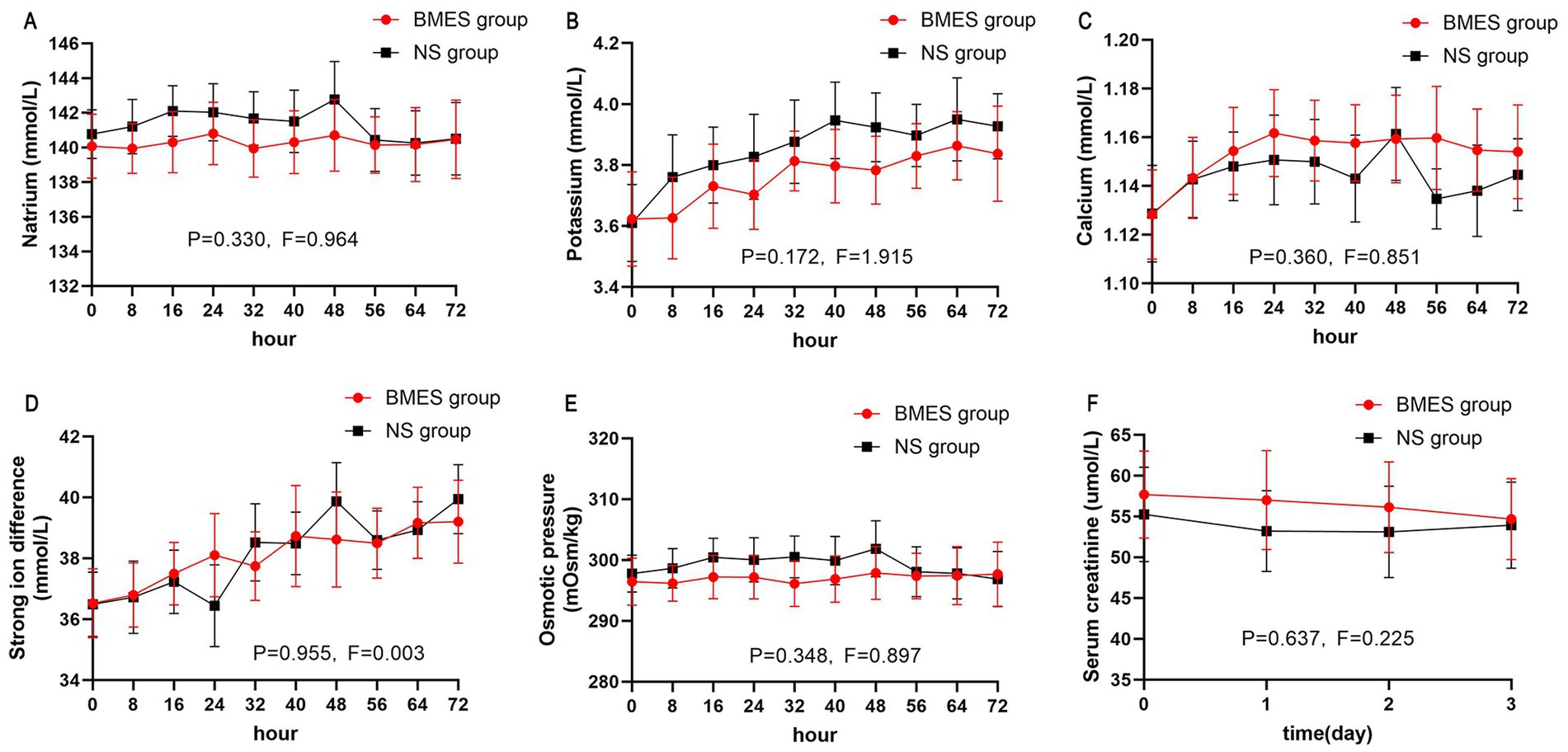 Graphs showing six comparative measurements between BMES and NS groups over time. Each graph includes error bars and displays data on natrium, potassium, calcium, strong ion difference, osmotic pressure, and serum creatinine, with respective P and F values indicating statistical analysis.