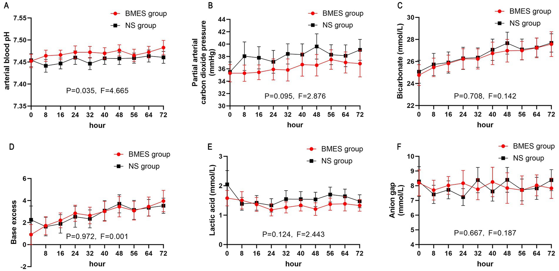 Six line graphs compare BMES and NS groups over 72 hours. Metrics include arterial blood pH, partial arterial carbon dioxide pressure, bicarbonate, base excess, lactic acid, and anion gap. Each graph shows data points with error bars, indicating variation over time. Statistical values for each measurement are provided, with p-values and F-values noted.