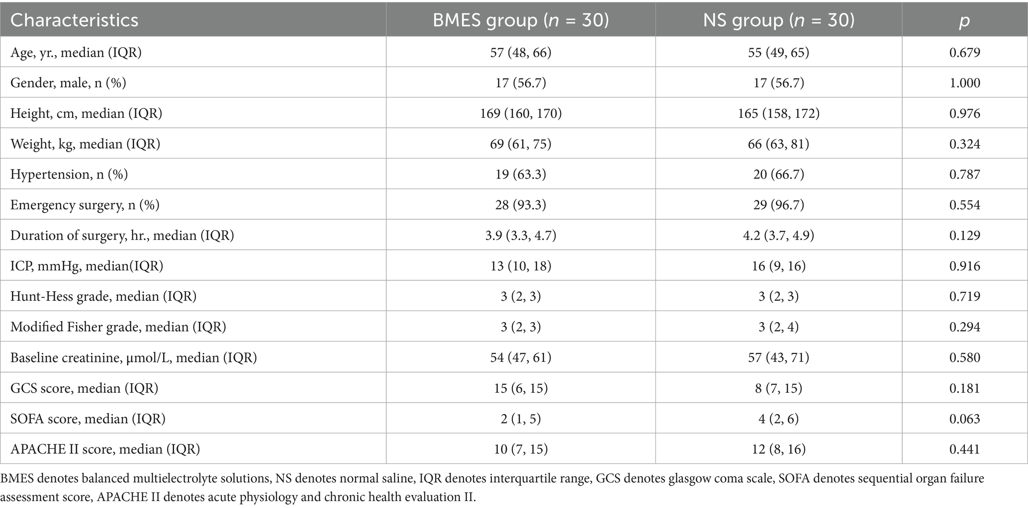 Therefore, we designed this pilot randomized trial aiming to compare the effect of BMES versus NS on the occurrence of hyperchloremia within 72 h in patients with aSAH. A secondary aim was to provide data for the design and power of a large-scale, multicenter, randomized controlled trial.