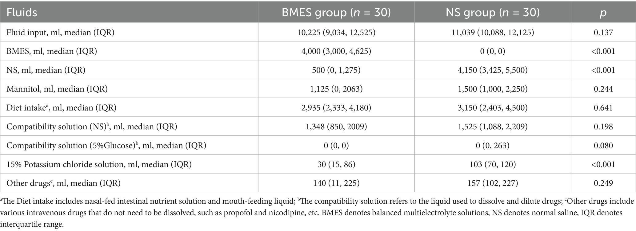 All study patients received the assigned fluid as the preferred resuscitation and overall hydration intravenous fluid for 72 h. There was no difference in overall fluid input during the study period, while BMES group received 4,000 mL infusion of study fluid and NS group received 4,150 mL (Table 2). The most common reason for the prescription of NS was to dissolve intravenous drugs as required by the drug labeling, and the volume was strictly limited. We also estimated the volume of osmotic therapy including mannitol and hypertonic saline, which both might has significant influence on electrolytes levels and no statistical difference was found. Volumes of other intravenous fluids, including dextrose solution, parenteral nutrition, mannitol, and blood products administered during the first three trial days, are shown in Supplementary Table S3. Difference in potassium chloride intake may be due to the allowance of 0.9% sodium chloride/ 5% dextrose injection as study fluid in the NS group which resulted in more insulin as well as potassium solution.