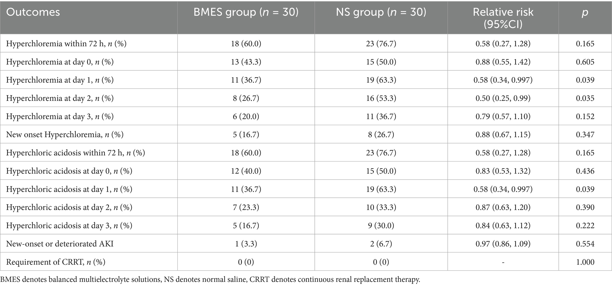 Results: Overall, 87 patients were randomized to receive BMES or NS, 60 patients (30 in each group) were enrolled for final analysis. Within 3 days of randomization, hyperchloremia occurred in 18/30 (60%) patients in the BMES group and 23/30 (76.7%) in the NS group (p = 0.165, relative risk 0.58, 95% CI 0.27–1.28). Incidence of hyperchloremia (BMES 36.7% vs. NS 63.3%, p = 0.039) and hyperchloremic acidosis (BMES 36.7% vs. NS 63.3%, p = 0.039) were decreased on trial day 1. There were no differences on bicarbonate, anion gap, serum creatinine, incidence of acute kidney injury, or length of hospital stay between groups.