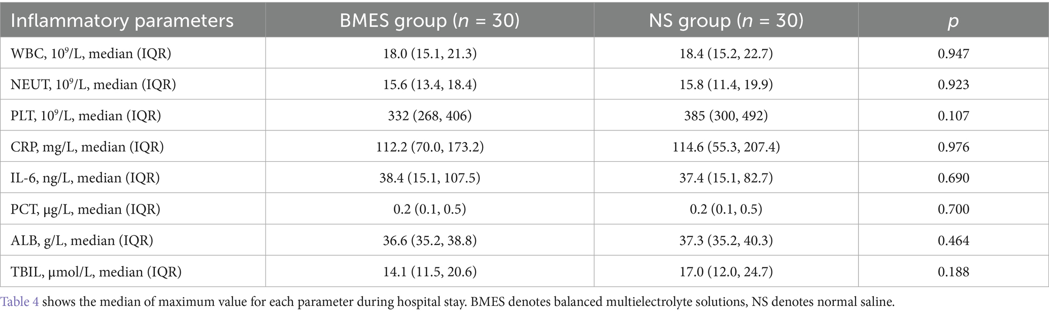 Patients allocated to the NS group received 0.9% saline (154 mmol/L sodium and 154 mmol/L chloride) or 0.9% sodium chloride/ 5% dextrose injection as maintenance fluids when isotonic intravenous fluid administration was ordered by the treating physician for three consecutive days after enrollment or until discharge or death, whichever happened first. Patients allocated to the BMES group received Multiple Electrolytes injection II (Sterofundin ISOTM, B. Braun, Germany, see electrolyte contents in Supplementary Table S1) when isotonic intravenous fluid administration was ordered for the same period.