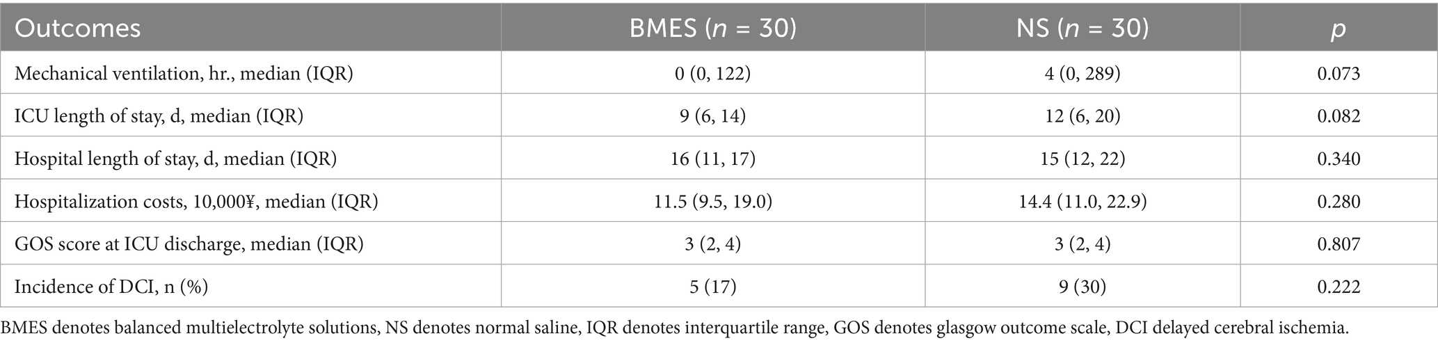 Despite the potential benefits of chloride restriction, recent clinical trials in large cohorts of critically ill patients have failed to show any improvement in mortality, which may be attributed to the highly heterogeneous populations that do not often receive large amounts of fluids (14, 15). Interestingly, SMART trial (13) showed that balanced solution infusions were associated with better clinical benefits in neurologic units. While the SALT trial (16) results indicated that the clinical impact of BMES versus NS may be volume-dependent. SAH patients with large fluid amount requirements may benefit more from it. Due to a lack of evidence, the choice of a balanced solution or NS in aSAH patients remains controversial, and whether BMES is a good candidate is unknown.