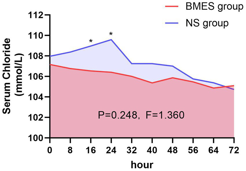 Figure 2. Serum chloride concentration during treatment period. Mean serum chloride levels in the BMES and NS groups are presented at 8-hour intervals. Statistically differences between groups were observed at 16 and 24 hour post-enrollment, whereas no significant difference was detected over the entire 72-hour intervention period.
