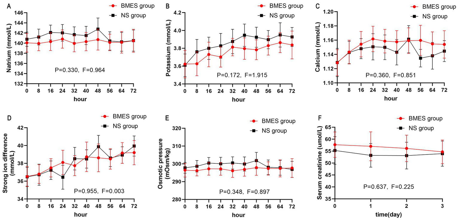 Other blood biochemical parameters such as serum sodium, potassium, calcium, BUN, and creatinine concentration did not differ between groups during the first 3 days after randomization (Figure 4; Supplementary Figure S1). In terms of arterial blood gas parameters during treatment, patients in the BMES group had a higher arterial pH (F = 4.664, p = 0.035), while other parameters were comparable between groups (Figure 5). Adverse events were reported in 2 of 30 (6.7%) patients receiving BMES versus 2 of 30 (6.7%) patients in patients receiving NS. The only adverse event was severe electrolyte disorder. No other adverse event was found.