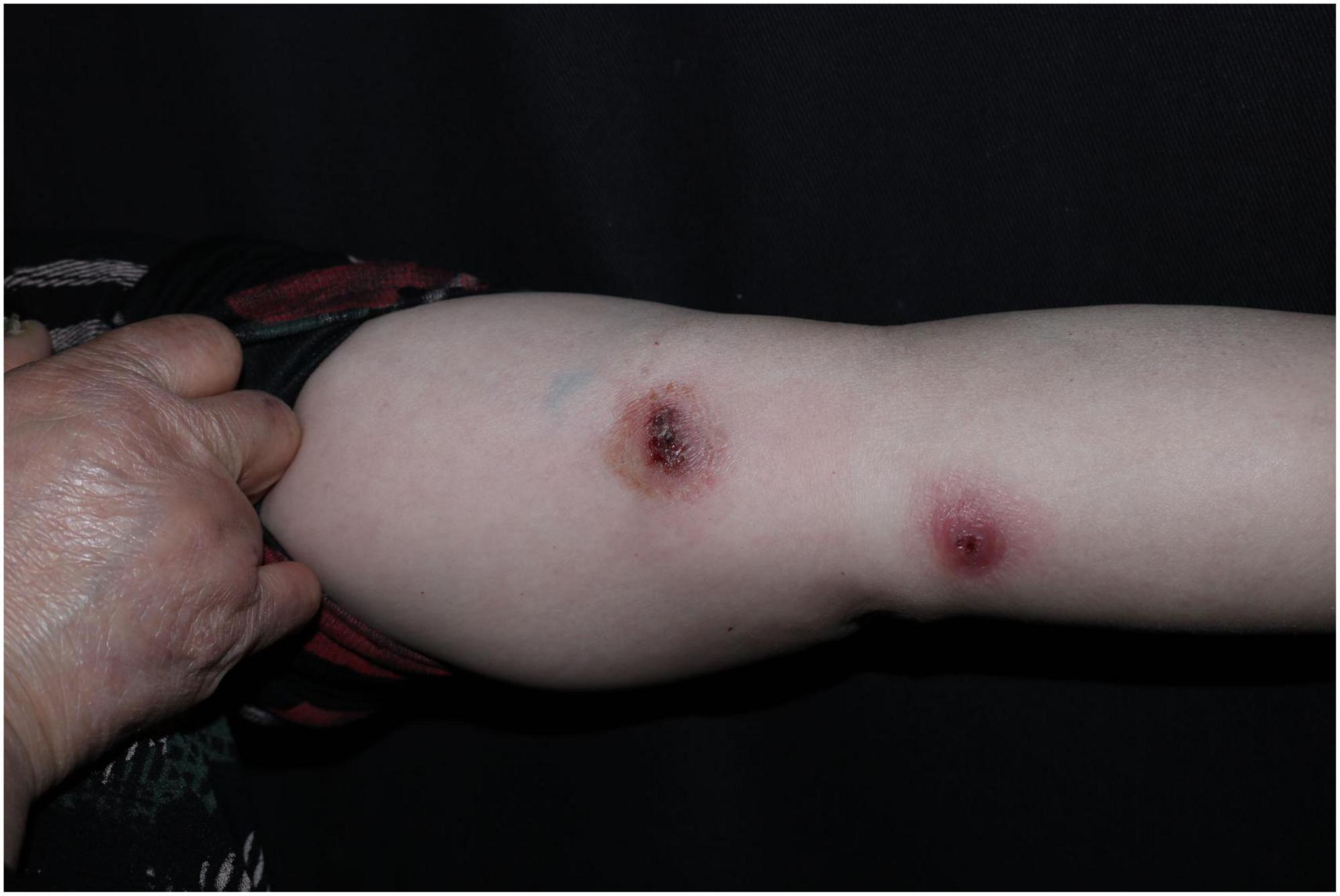 Figure 1. Two isolated erythematous nodules with superficial ulceration on the medial aspect of the left upper arm.